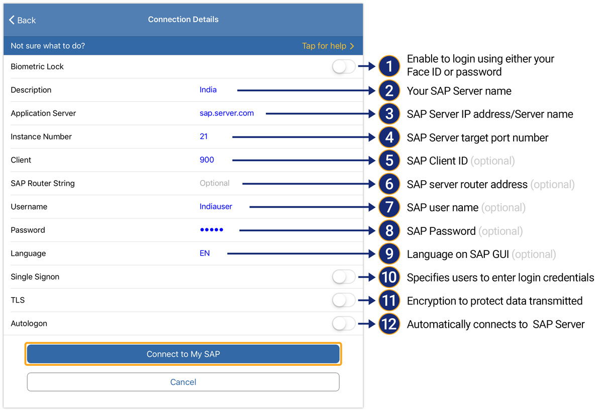 - Then, the Connection Details screen will appear with details related to SAP connection, such as biometric lock, description, application server, instance number, client, SAP router string, and other details, as listed below. Fill out the form with the required details to add your SAP connection, and click Connect to My SAP.
