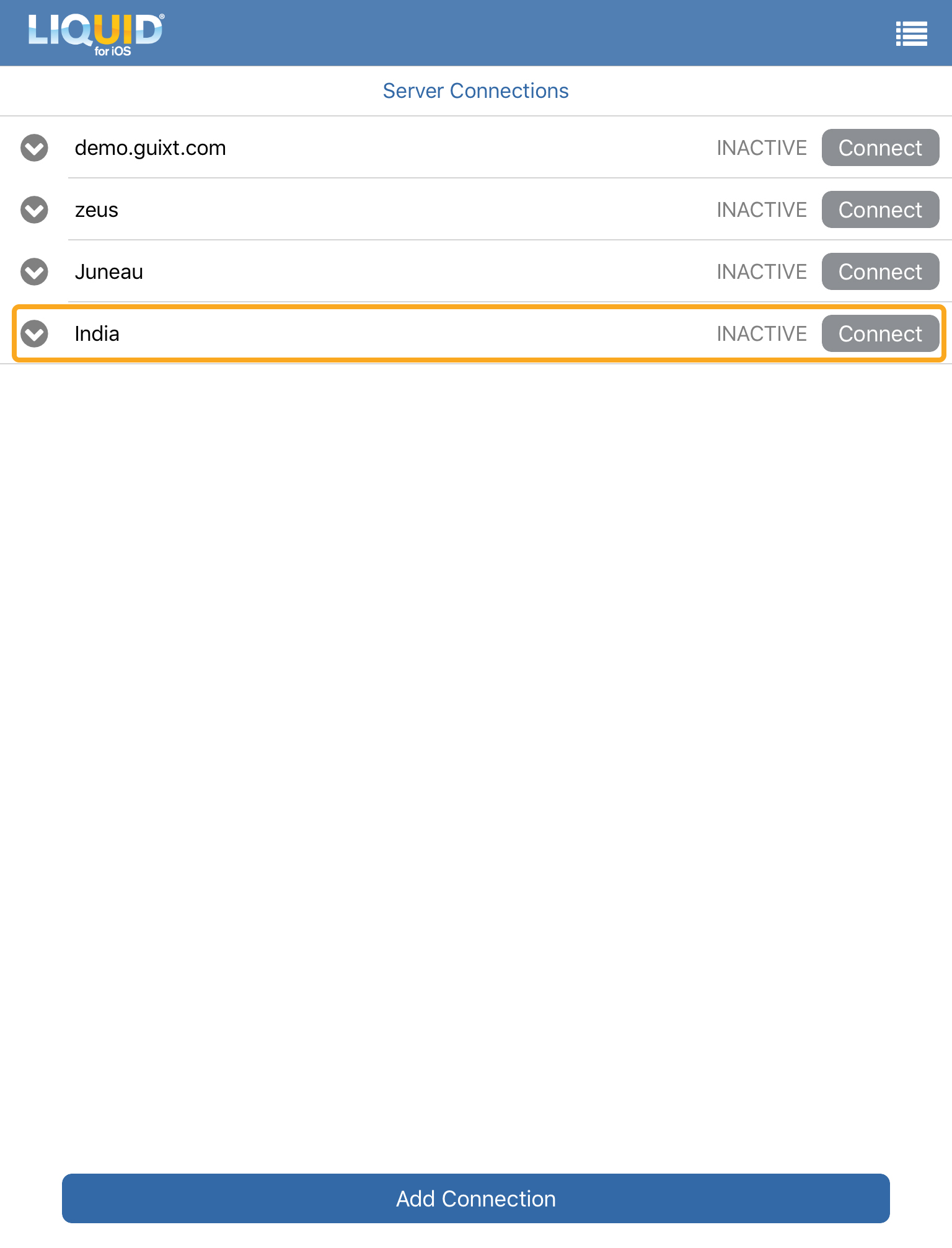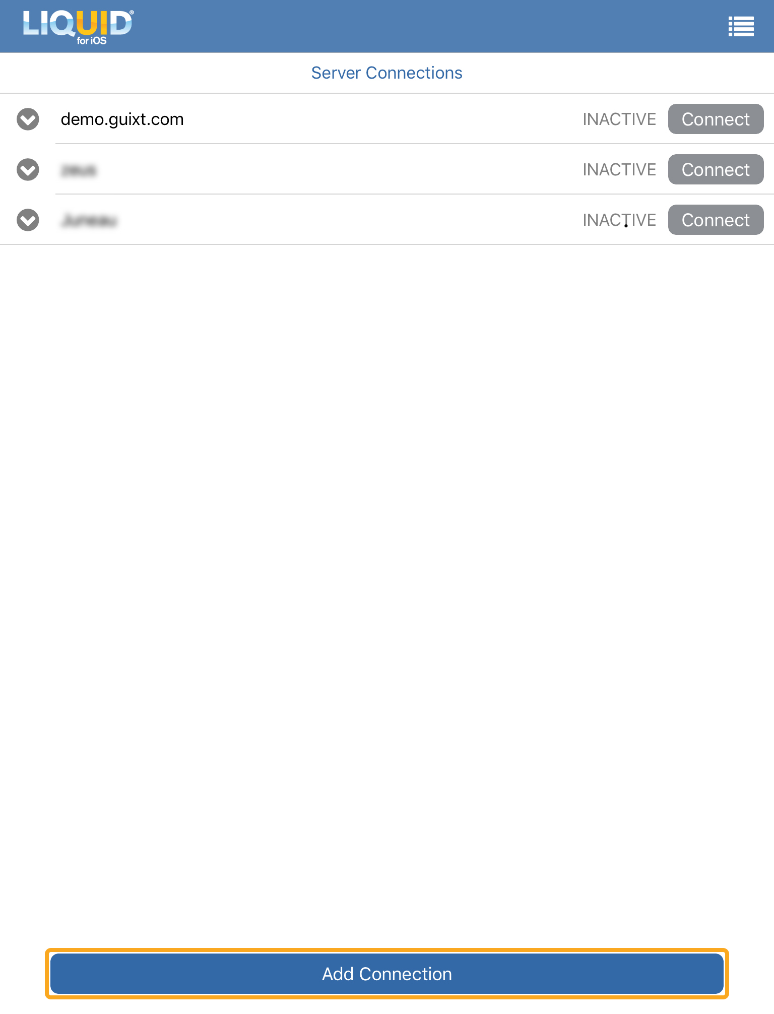 - Log in to your Liquid UI for iOS app. On the appeared Server Connections screen, click on Add Connection to add a new connection.