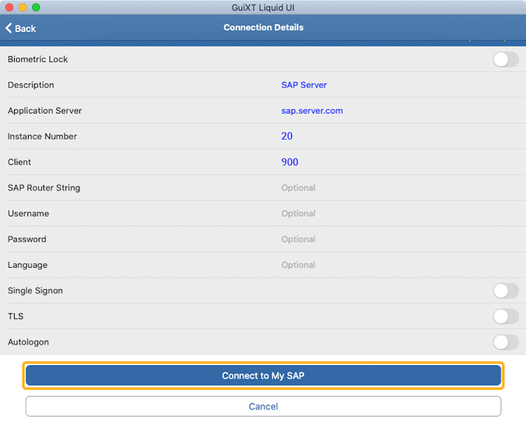 - Then, the Connection Details screen will appear with details related to the SAP connection, such as Biometric lock, Description, Application Server, Instance Number, Client, SAP Router String, and other information, as listed below. Fill out the required details to add your SAP connection, and click Connect to My SAP.