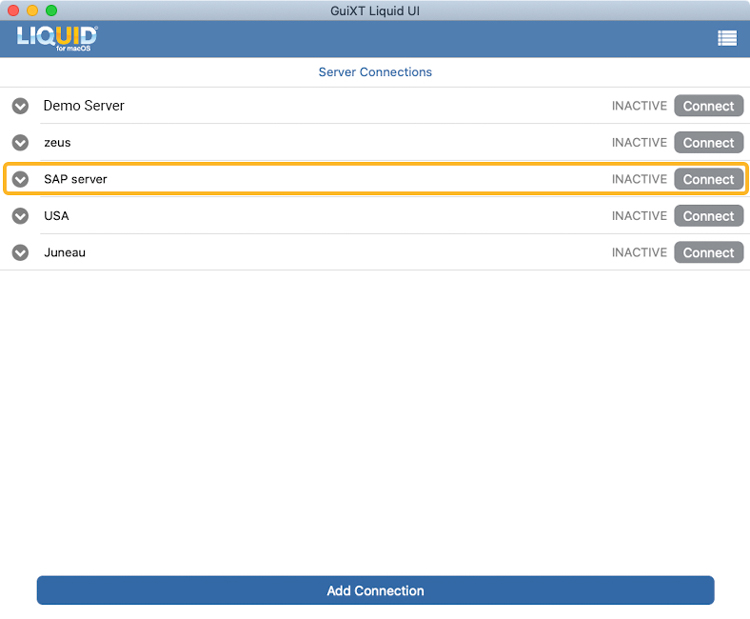 - Log into your Liquid UI for macOS app. On the Server Connections screen, click Add Connection to add a new connection.
