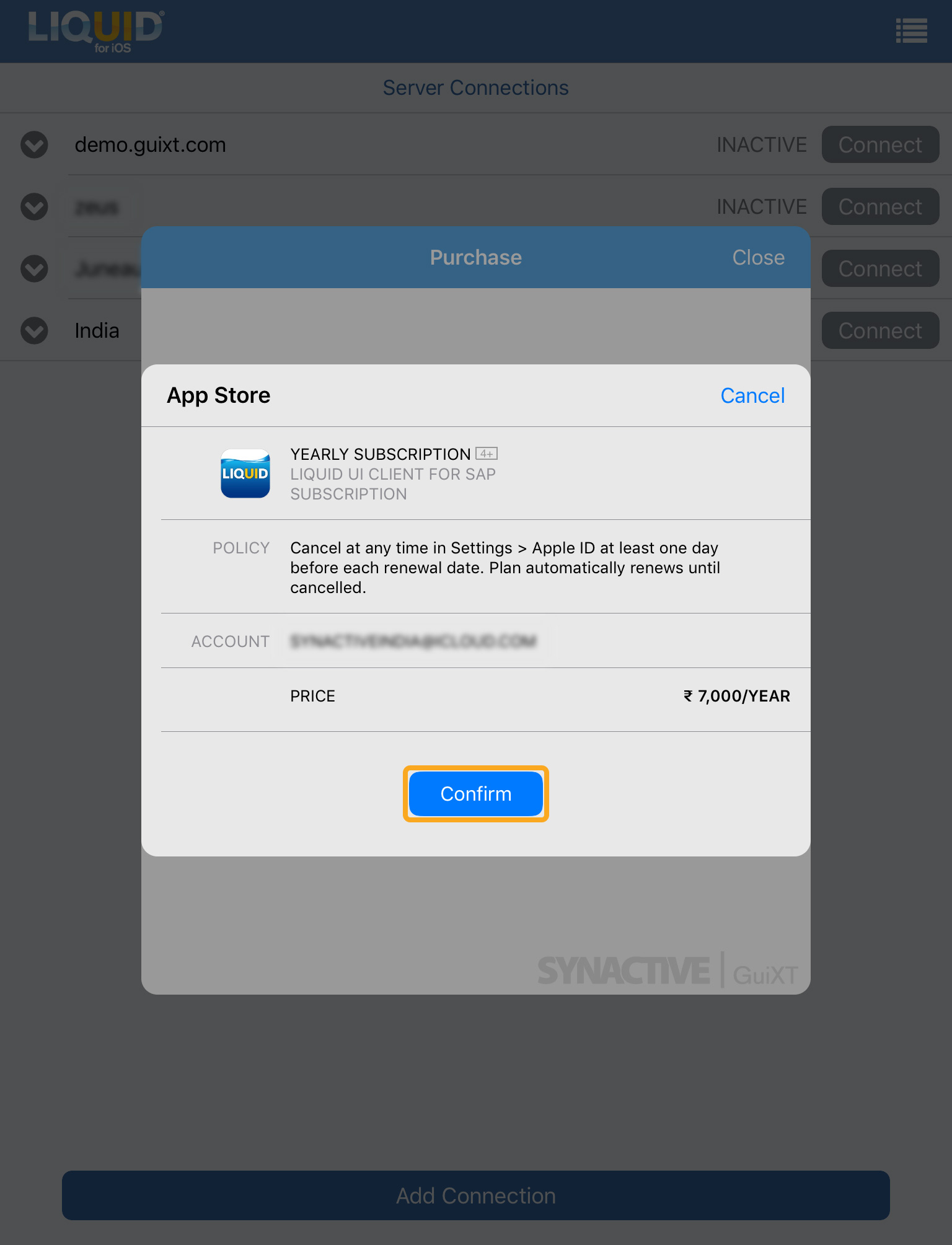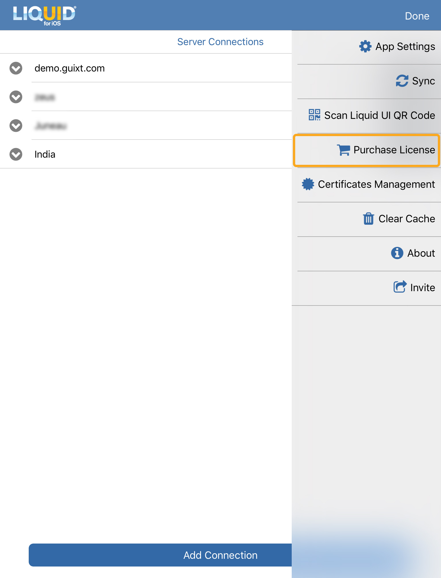Note: Without a valid license, you are restricted to connecting to two SAP connections and have a 150-packet limit between the app and server. If you want to access the full functionality of Liquid UI for iOS, you need to send a license request to Synactive through License Assistance from the Liquid UI for iOS app.
