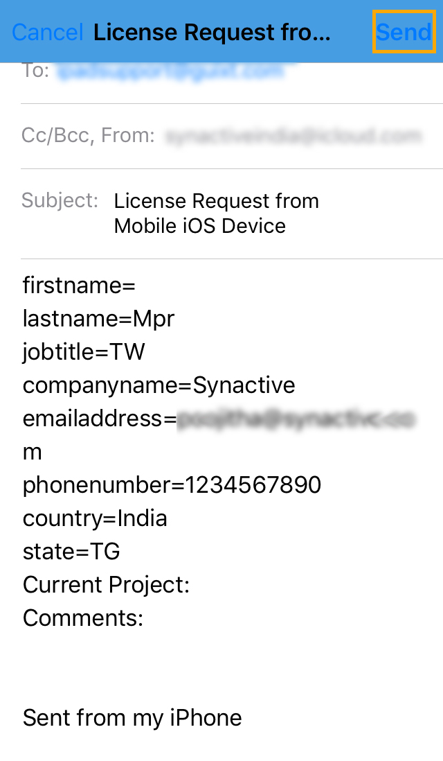 - Fill out the form and click the Send button. An email with the form details will pop up. The email can be edited before being sent to Synactive. You will hear from the support staff and receive a free trial license.