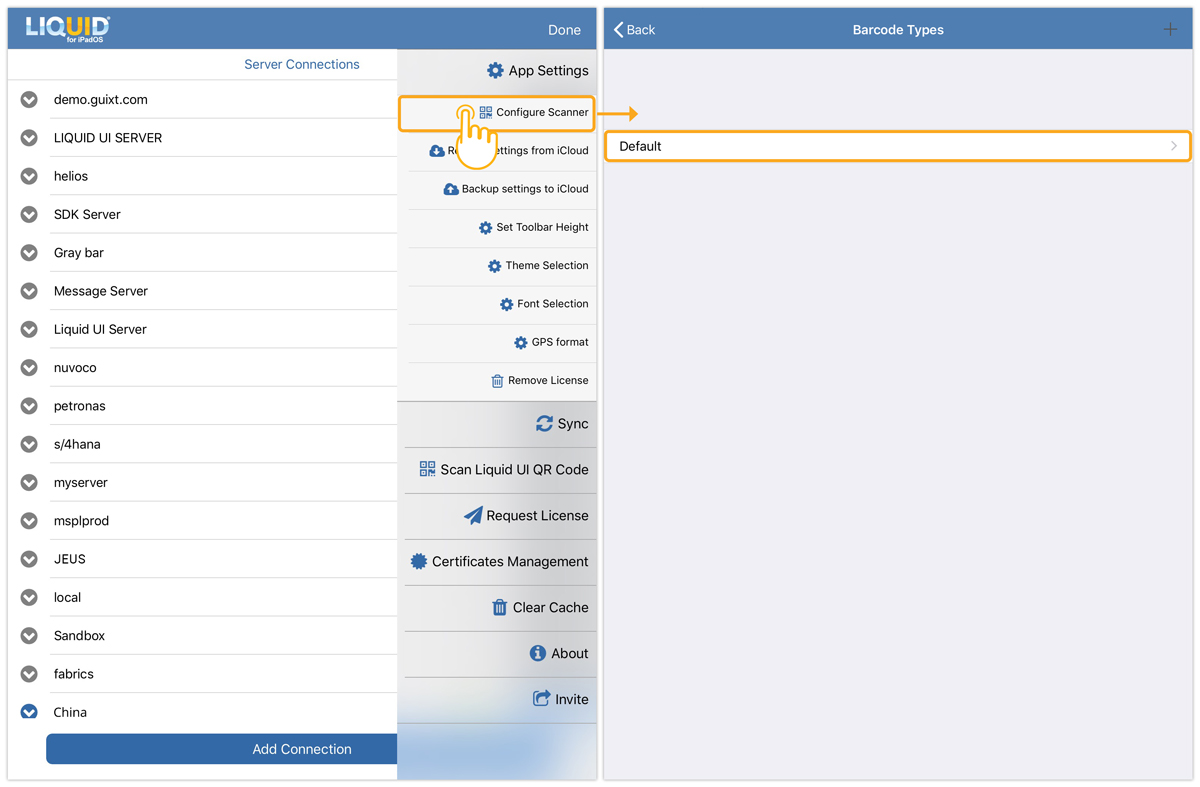 This option lets you configure a barcode scanner. Liquid UI for iOS supports barcode scanning and enables iOS users to populate any SAP field with a single click.