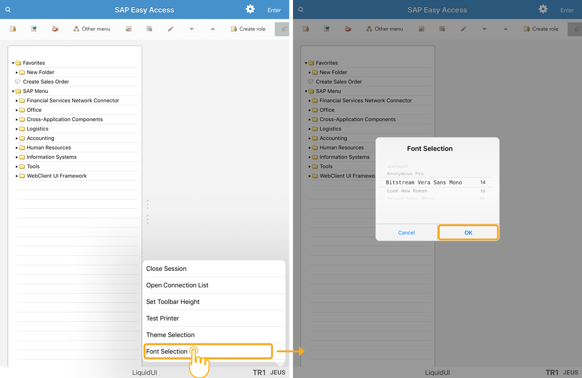 This option lets you change different types of font styles on your SAP screens. Select the desired font style that you want to set and click OK. Then, you can see the chosen font on the transaction screen.
