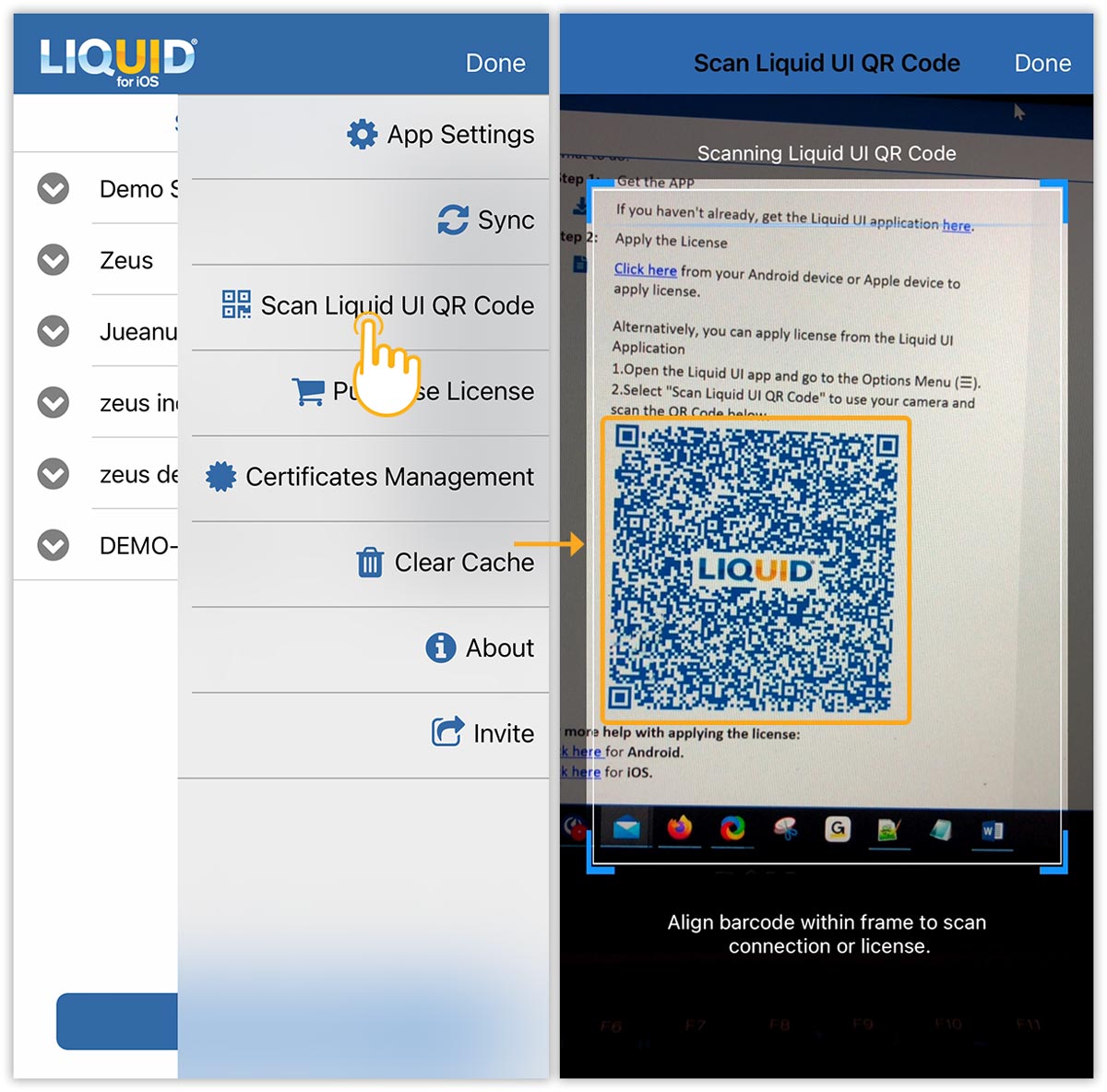 - Select Scan Liquid UI QR Code. Your camera will activate and work as a QR code scanner to scan and apply the license to your device.