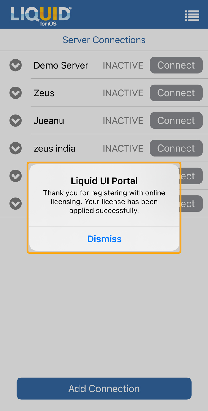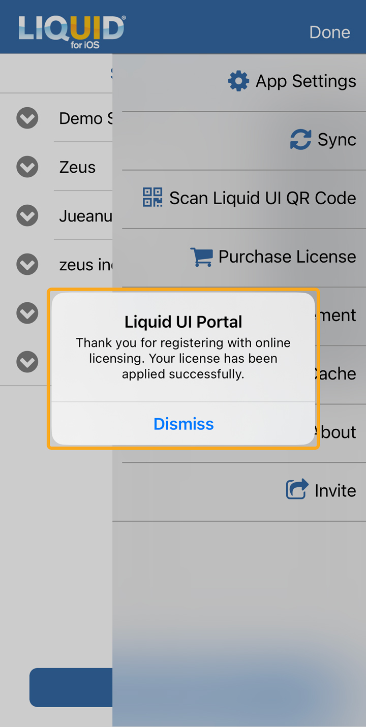 - Once your license is installed, a success message is displayed acknowledging the successful license installation on your Liquid UI for iOS.