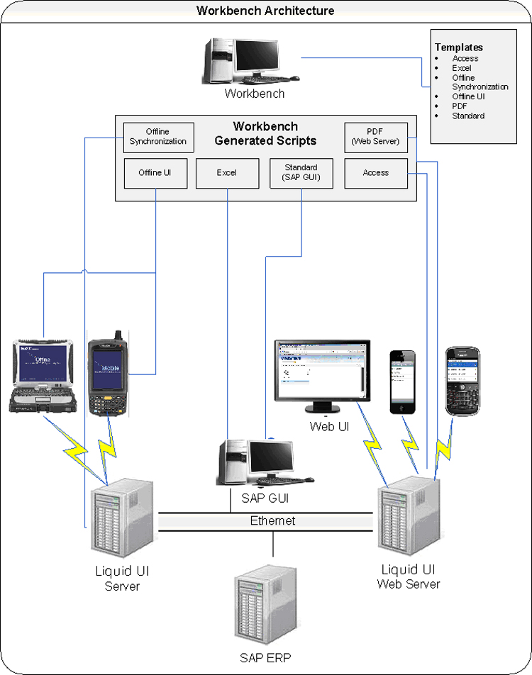 Liquid UI Workbench is a development tool used to generate the scripts, required for deploying the Liquid UI environment. The architecture of how Workbench fits into the various Liquid UI deployments are shown below.