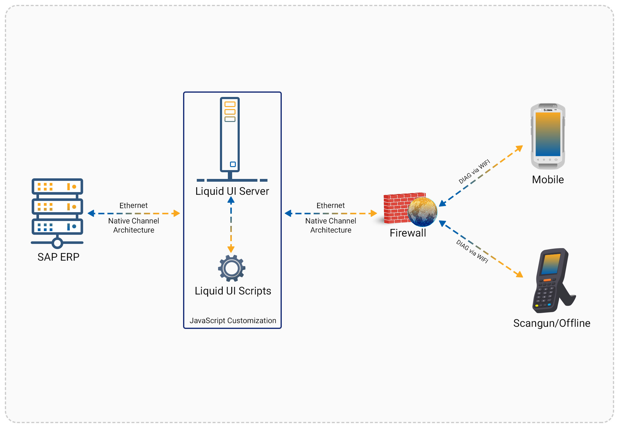 Mobile connects to the handheld devices using wireless, but the connection between the Liquid UI Server and the SAP ERP system is a wired ethernet connection. Both the Liquid UI Server and the SAP ERP system itself will reside behind the customer's corporate firewall. A typical Liquid UI for Handheld Scanguns deployment architecture is as follows:
