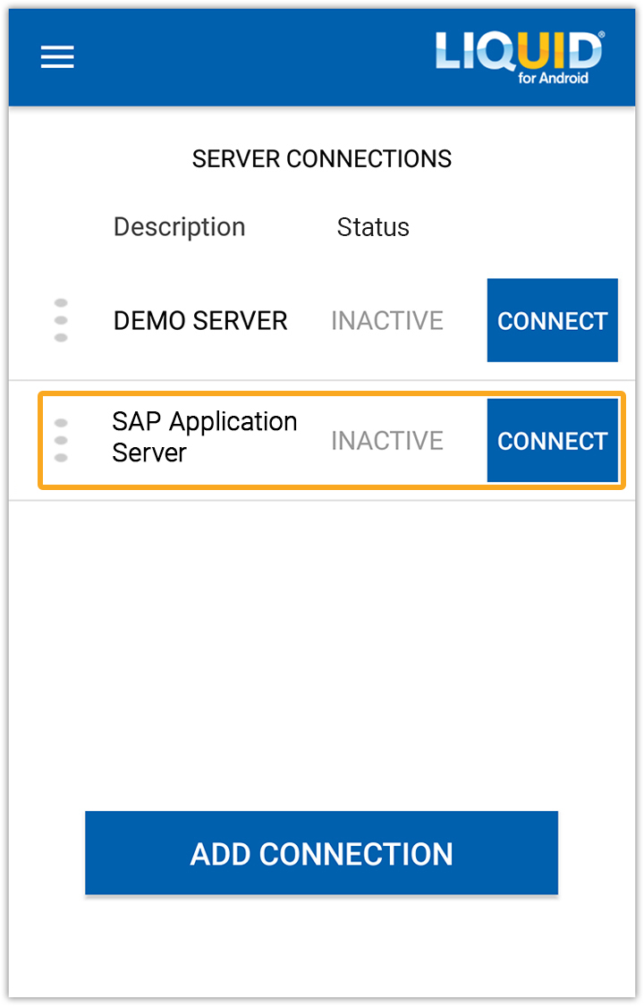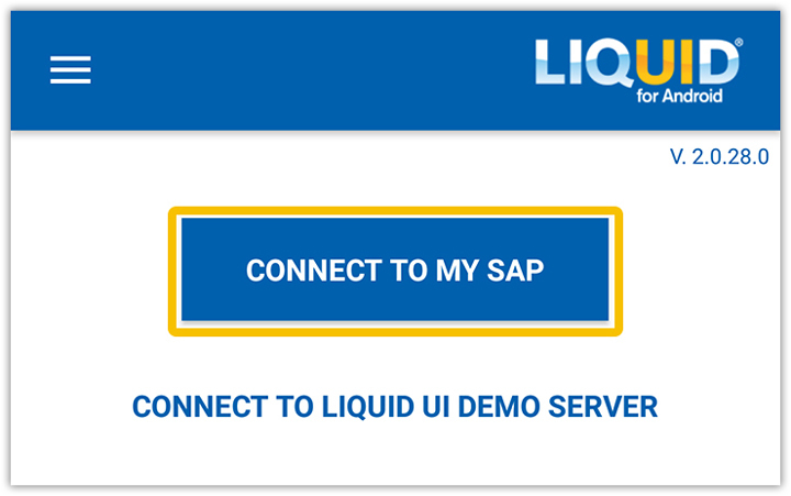 - Open your Liquid UI for Android application. On the screen that appears, select CONNECT TO MY SAP in order to establish a connection with your SAP server.