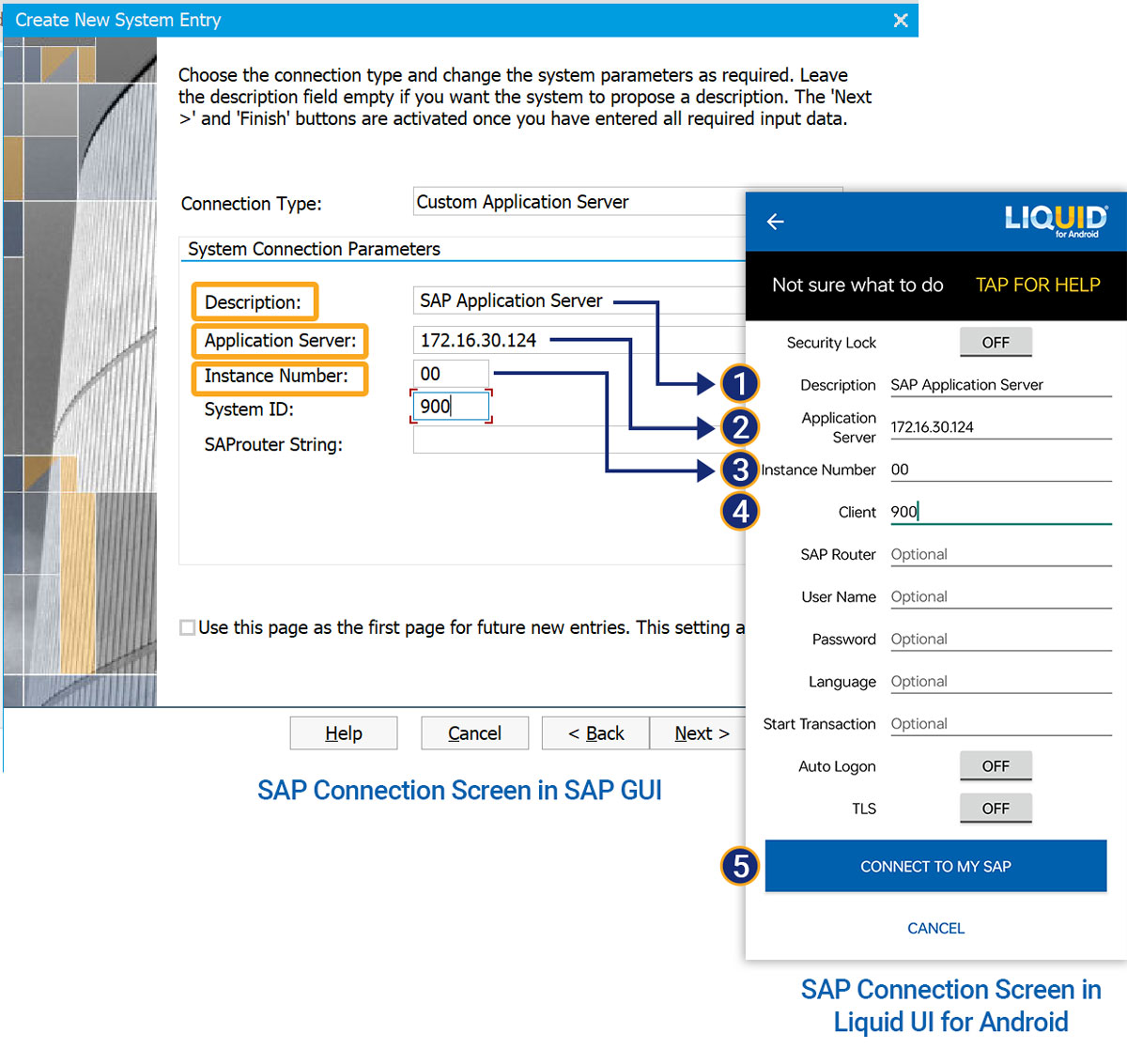 - Instance Number specifies the target port that connects either the SAP application server or the Liquid UI Server.