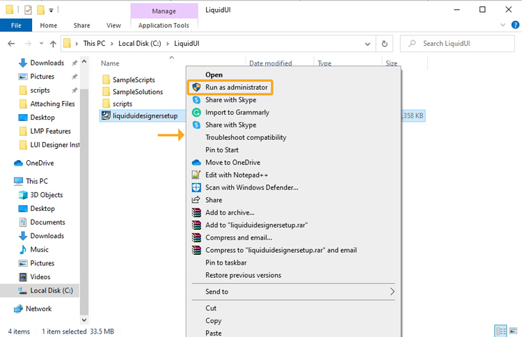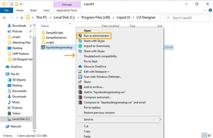 - Right-click on the LiquidUI Designer software file (liquiduidesignersetup.exe). Select Run as administrator to make sure that the software is installed with the correct privileges.