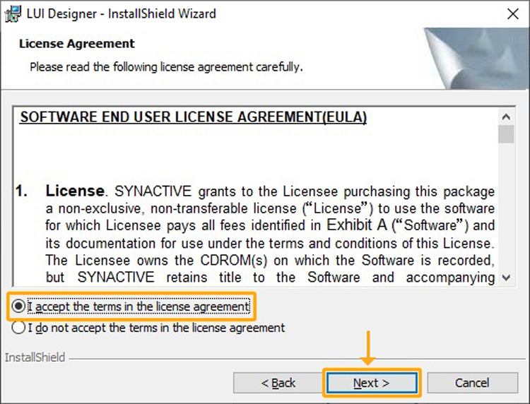 - The End User License Agreement (EULA) window will display. Check the I accept..the license agreement radio button, and then click Next.