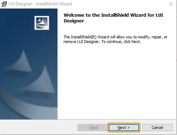 Note: Make sure that your antivirus software is not blocking Liquid UI files: designer.exe and webscript.dll. You need to have admin privileges to install the designer software. - The InstallShield Wizard will start and the Welcome screen will appear. Click Next.