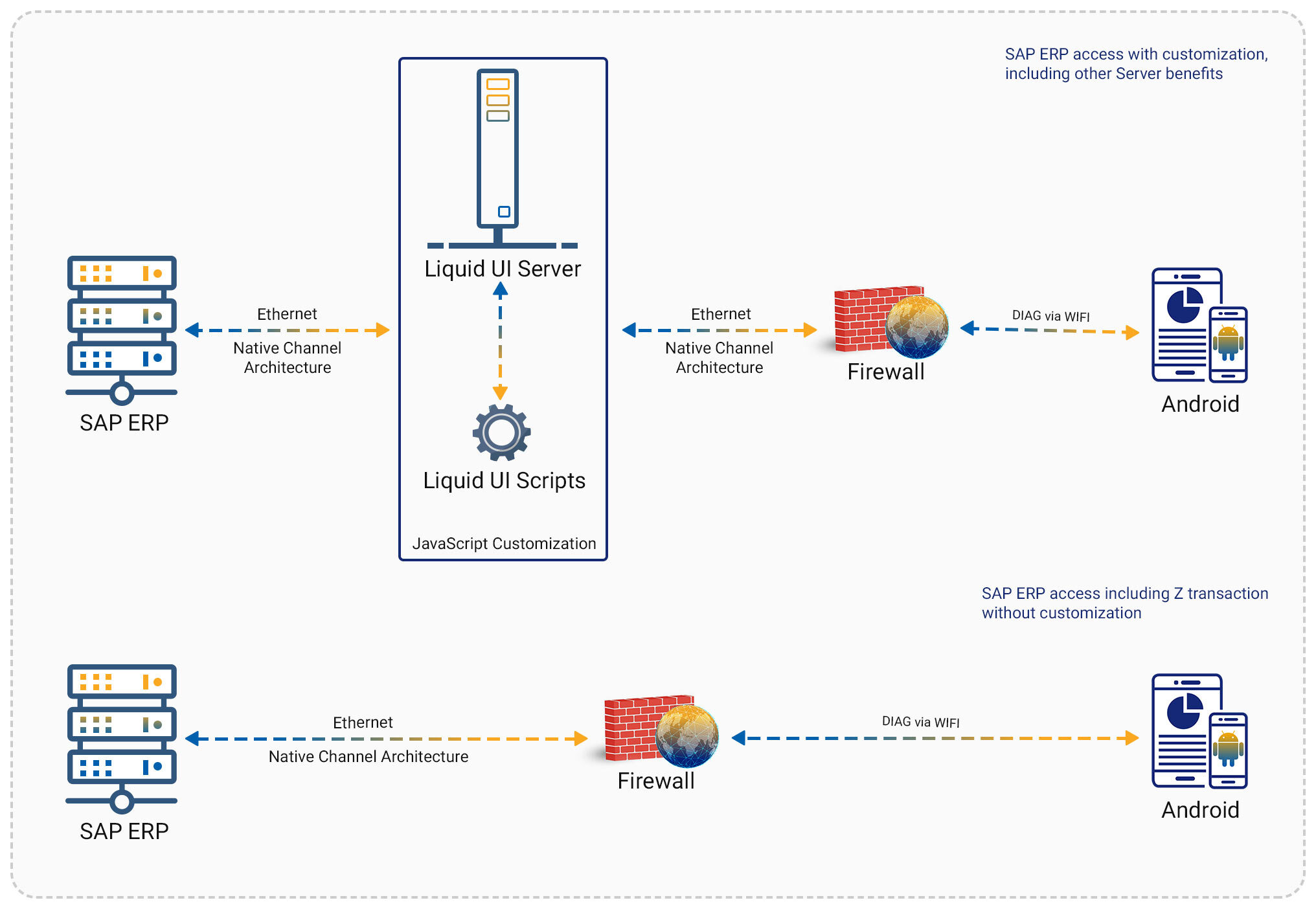 The Liquid UI Server and the Android devices running the Liquid UI app communicate wirelessly. Within the customer's corporate firewall, an Ethernet connection connects the Liquid UI Server and SAP ERP systems.