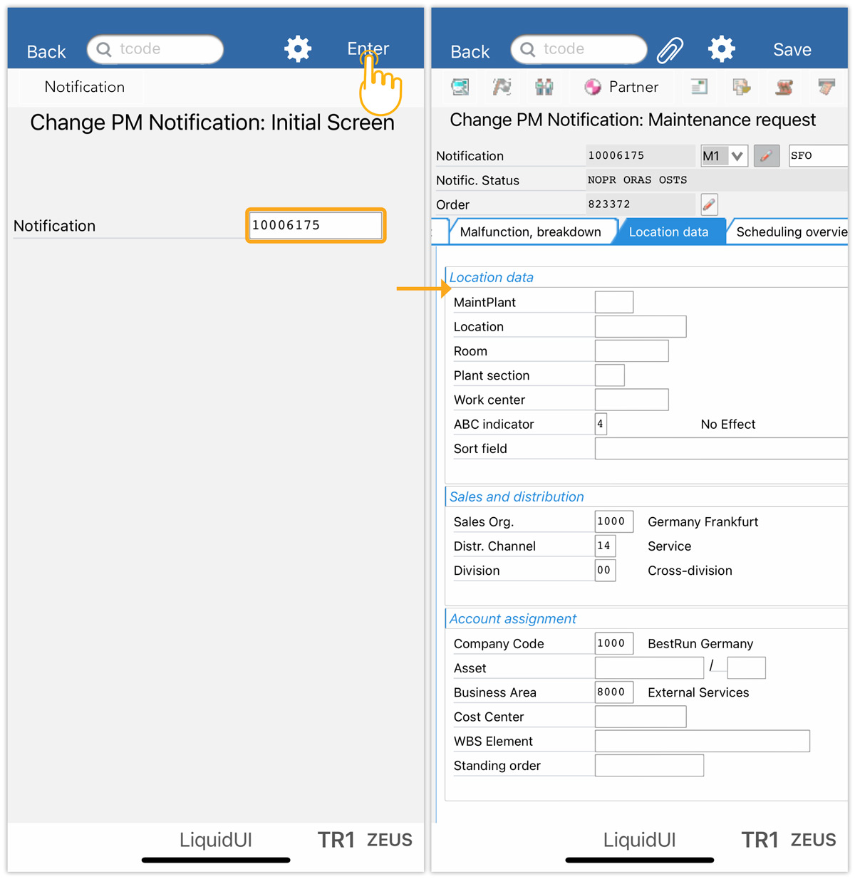- On the IW22 screen, enter the Notification ID for which you need the location details and click Enter. This will take you to the Change PM Notification: Maintenance Request screen, as shown below.