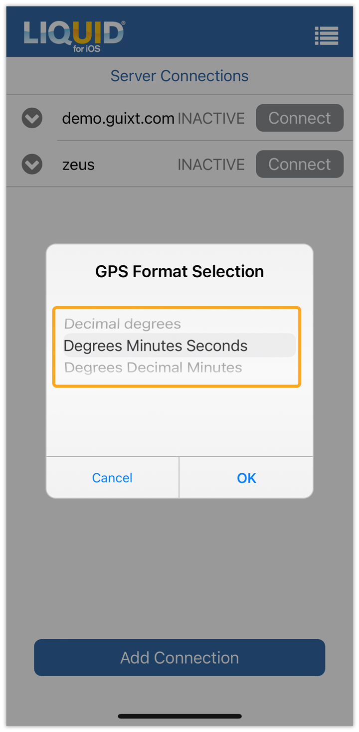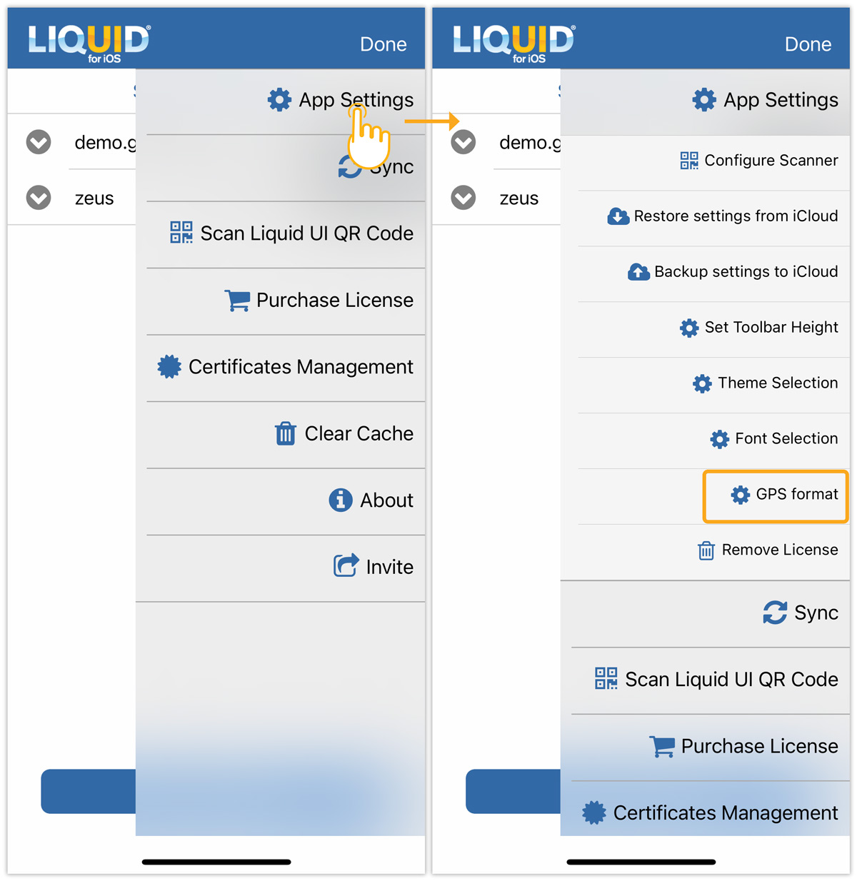 - On the Liquid UI for iOS application, navigate to the Main Menu, select App Settings, and choose GPS format from the available options.