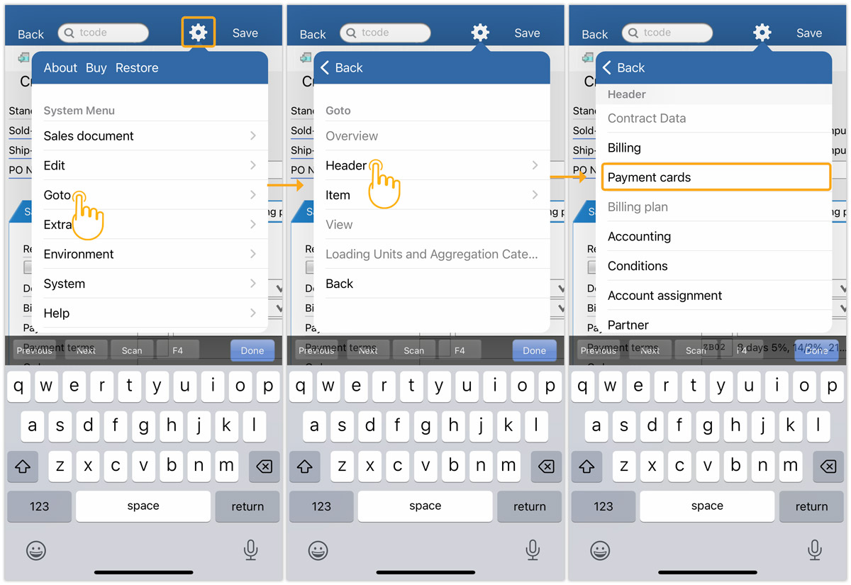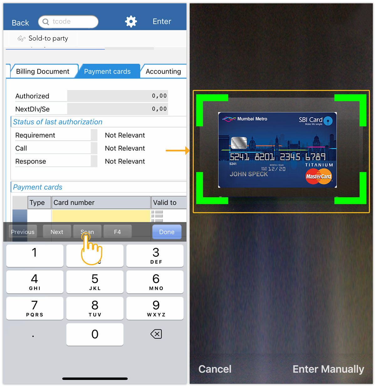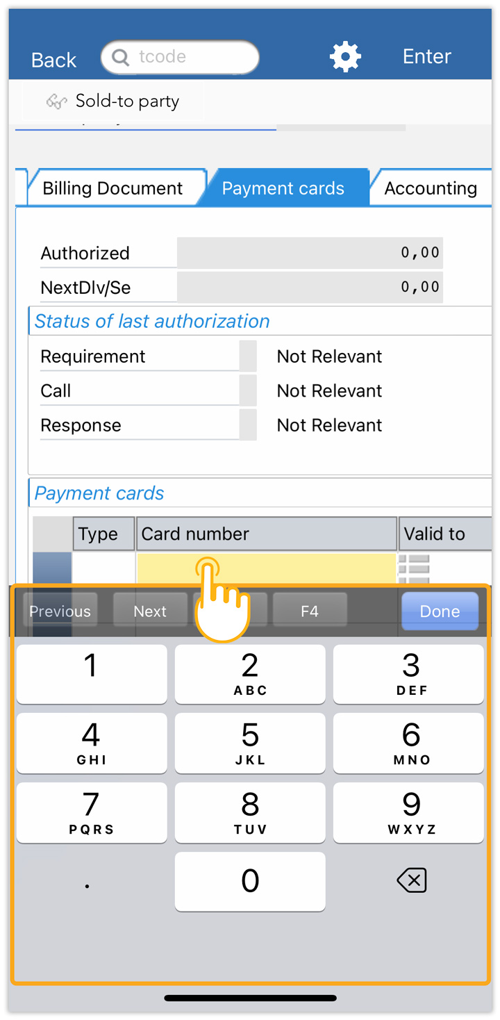 - Tapping on the cell under the Card number displays a numeric keyboard along with Previous, Next, F4, Scan, and Done options.