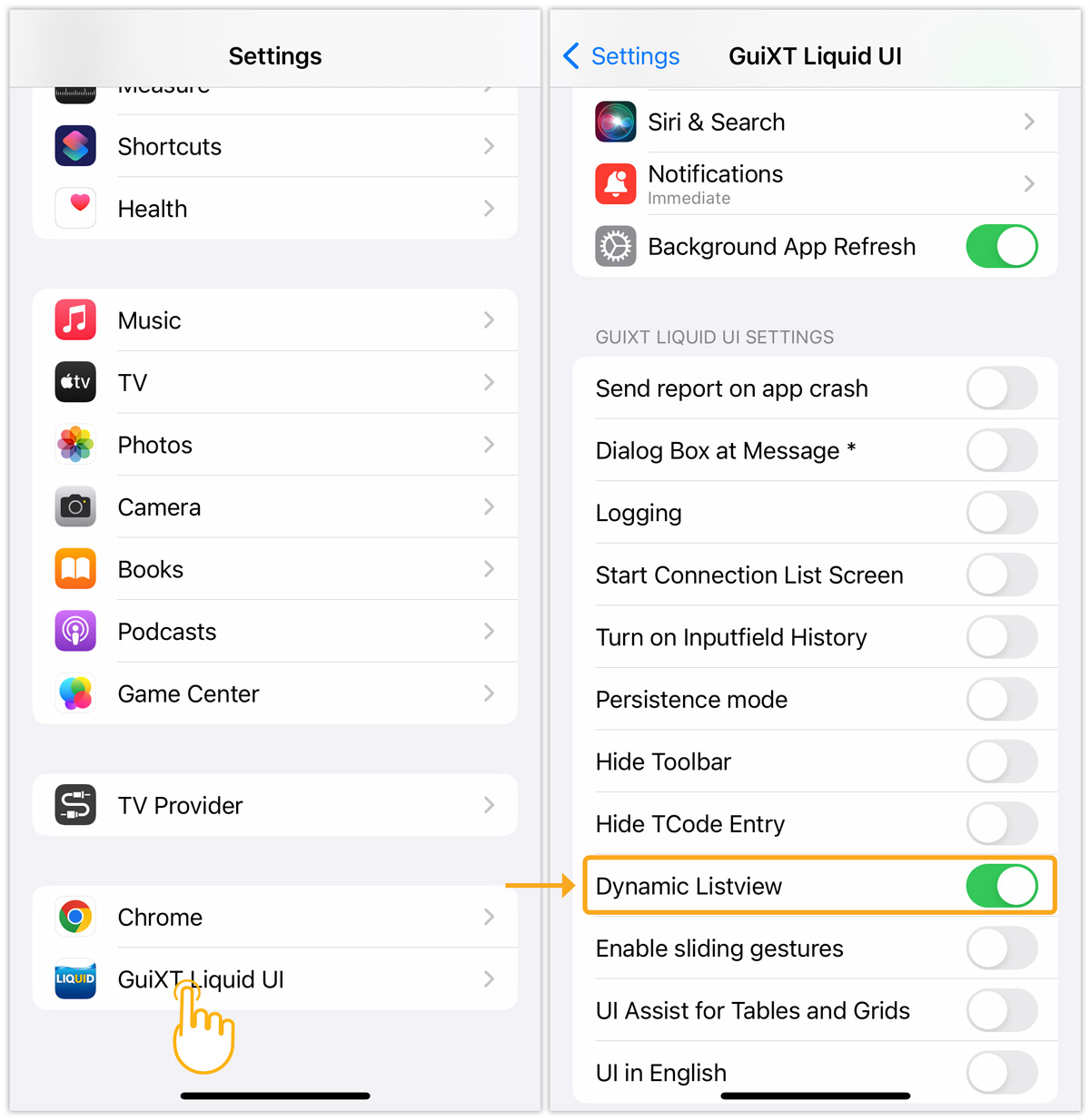 - Navigate to your device Settings and scroll to the Liquid UI app. Enable the Dynamic Listview option from the available settings.