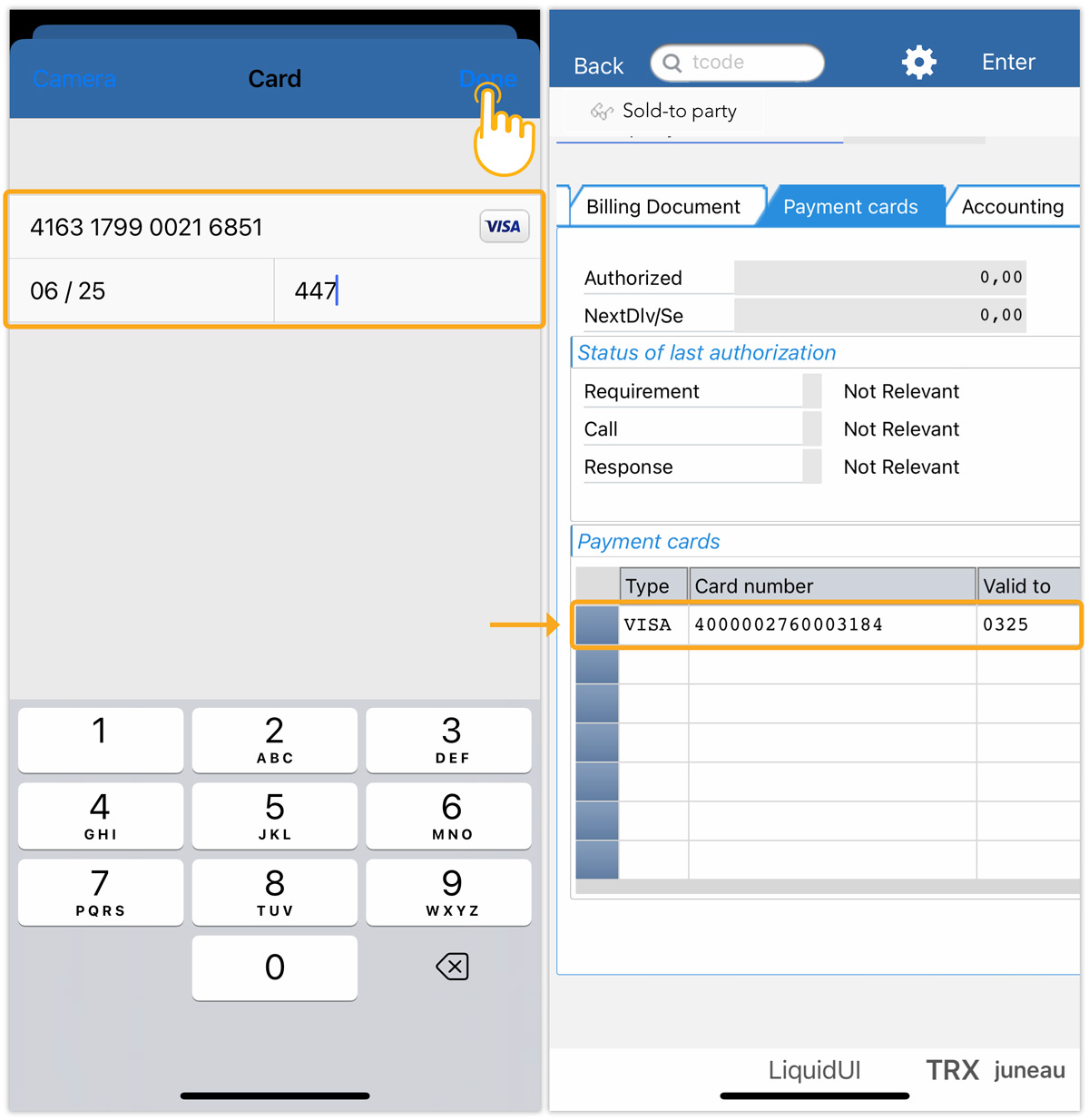 With Liquid UI for iOS, you can seamlessly scan Credit Card information into the input fields, native SAP, and Liquid UI tables. Liquid UI's Scan feature efficiently captures Credit Card numbers, expiry dates, and CVVs, eliminating errors and reducing the time spent on payment information entry.