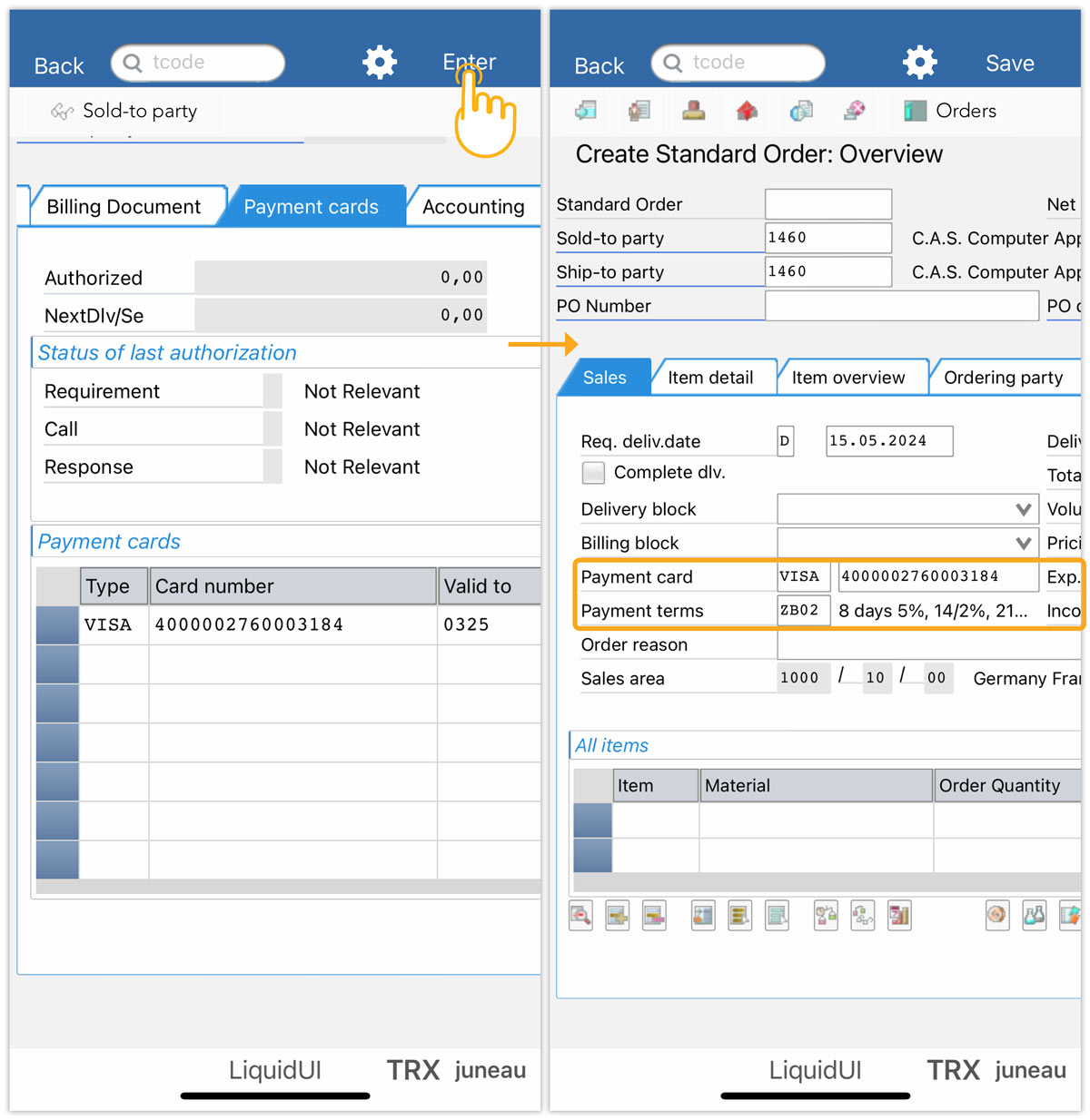 - Upon pressing Enter, you will be directed to the Create Standard Order: Overview screen where you can view the added card details under the Sales tab.