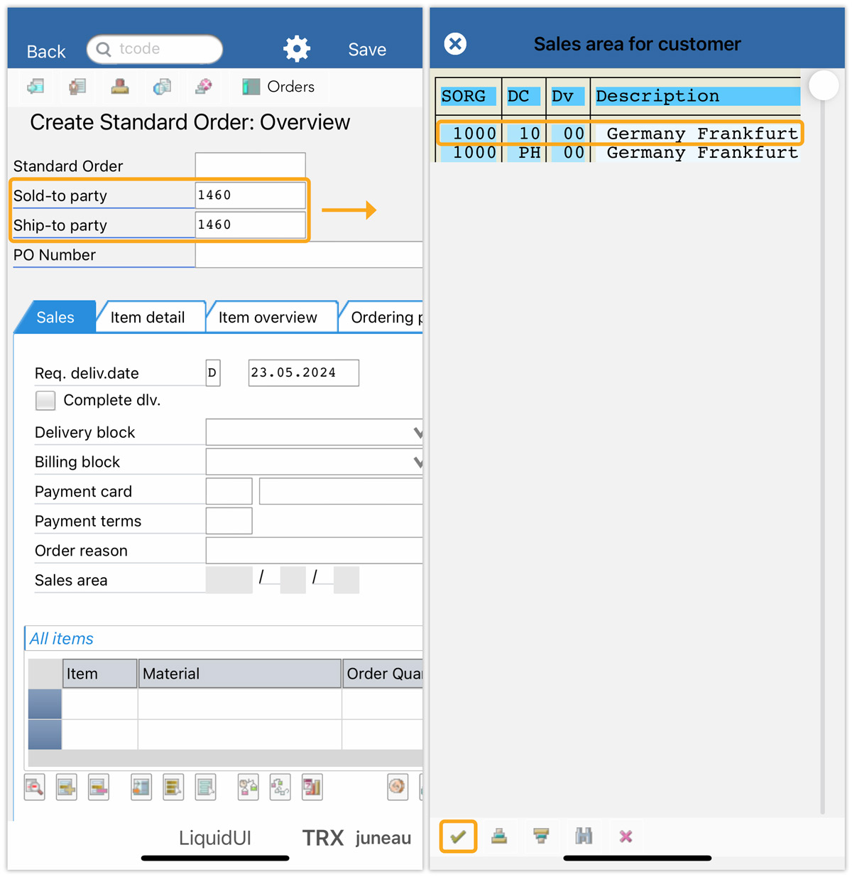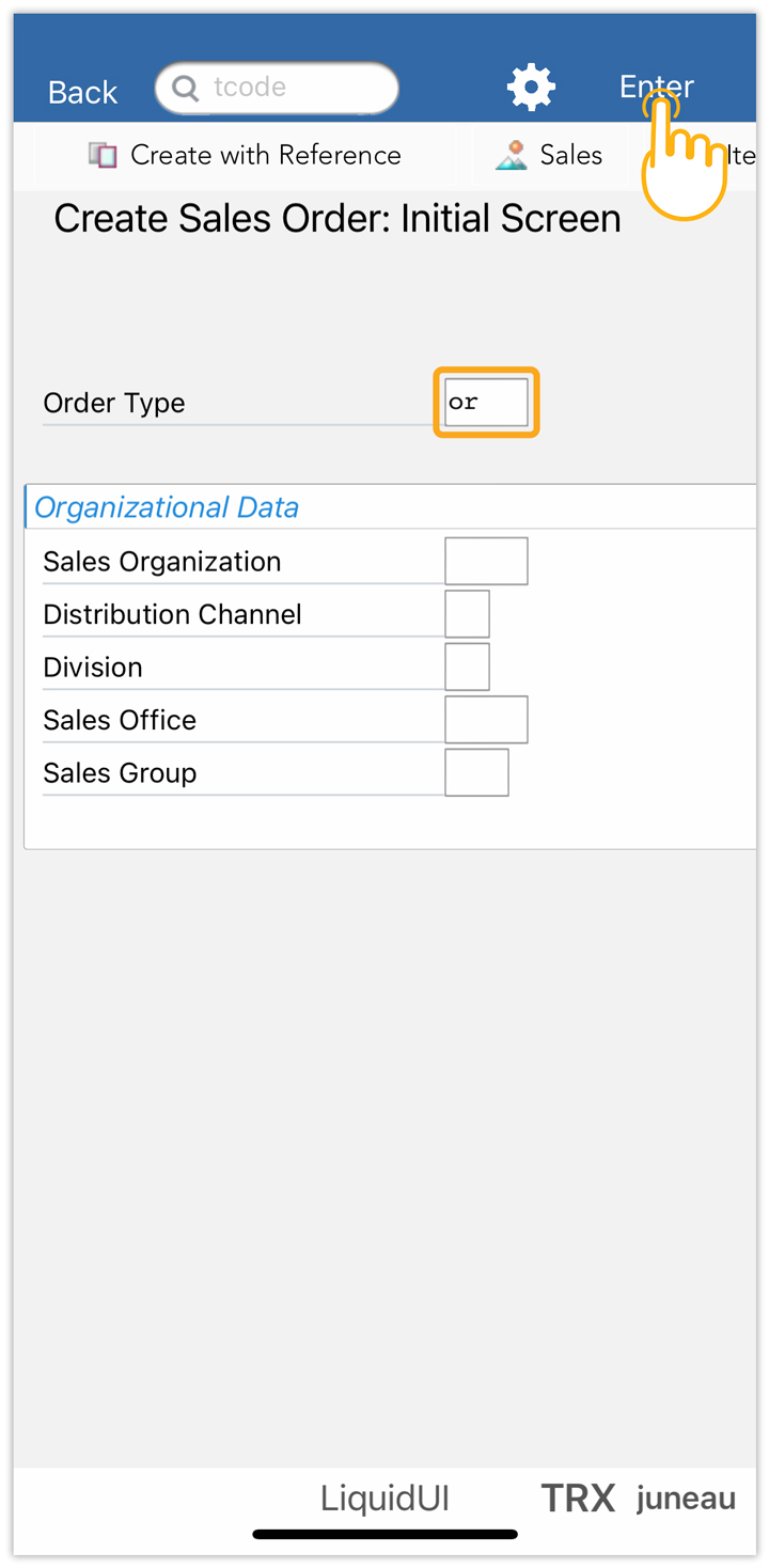 - Open Liquid UI for iOS app. Navigate to the VA01 screen, input the Order Type, and tap Enter to proceed.