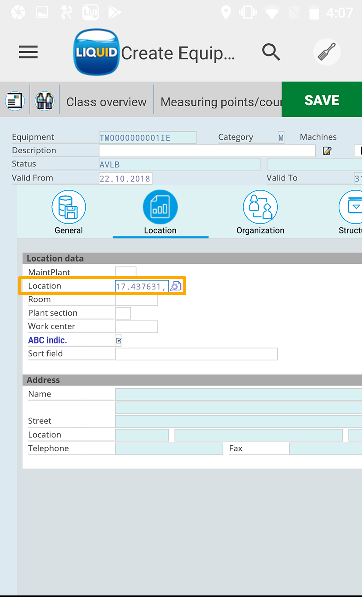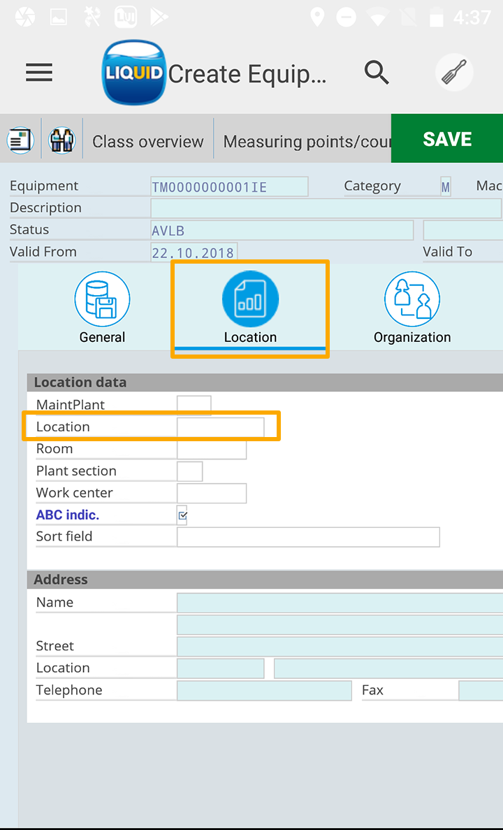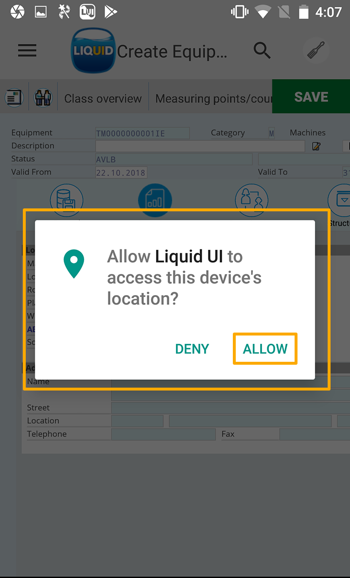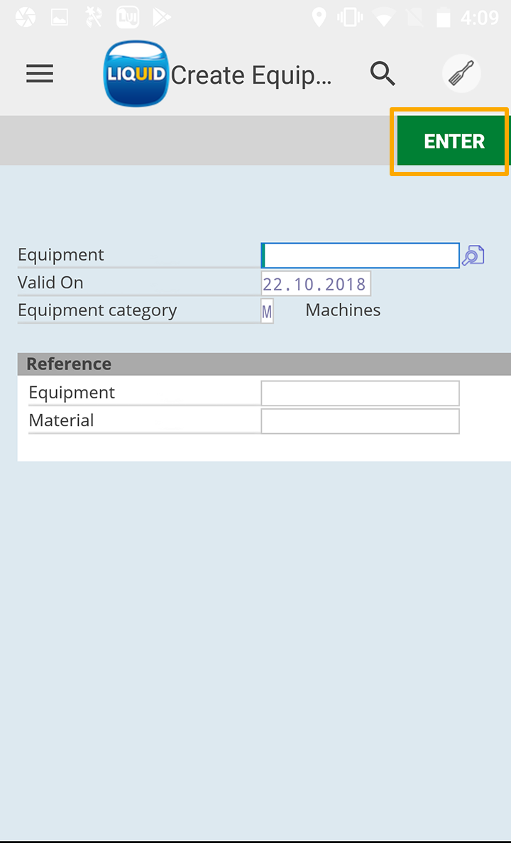 - Open the Liquid UI for Android App, and then navigate to any SAP transaction. For Example, consider IE01 (Create Equipment screen), as shown below; press enter.