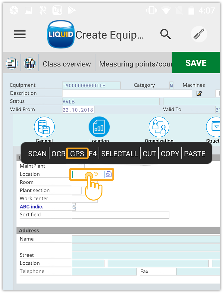 Liquid UI for Android supports the GPS (Global Positioning System) feature, which eliminates manual data entries by populating the latitude and longitude values of the location. It enables the users to populate geographical coordinates on any SAP Input Field with a long press. Also allows users to locate themselves on a map, which helps users map, find, and navigate to desired destinations via detailed directions using different methods. You can enable the GPS feature using the long-press gesture on the required Input Field.