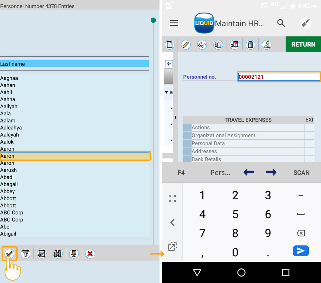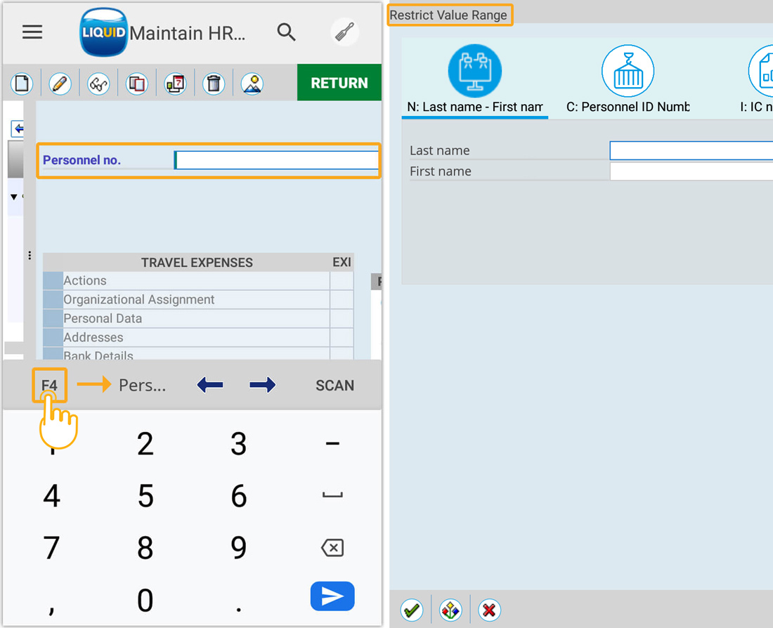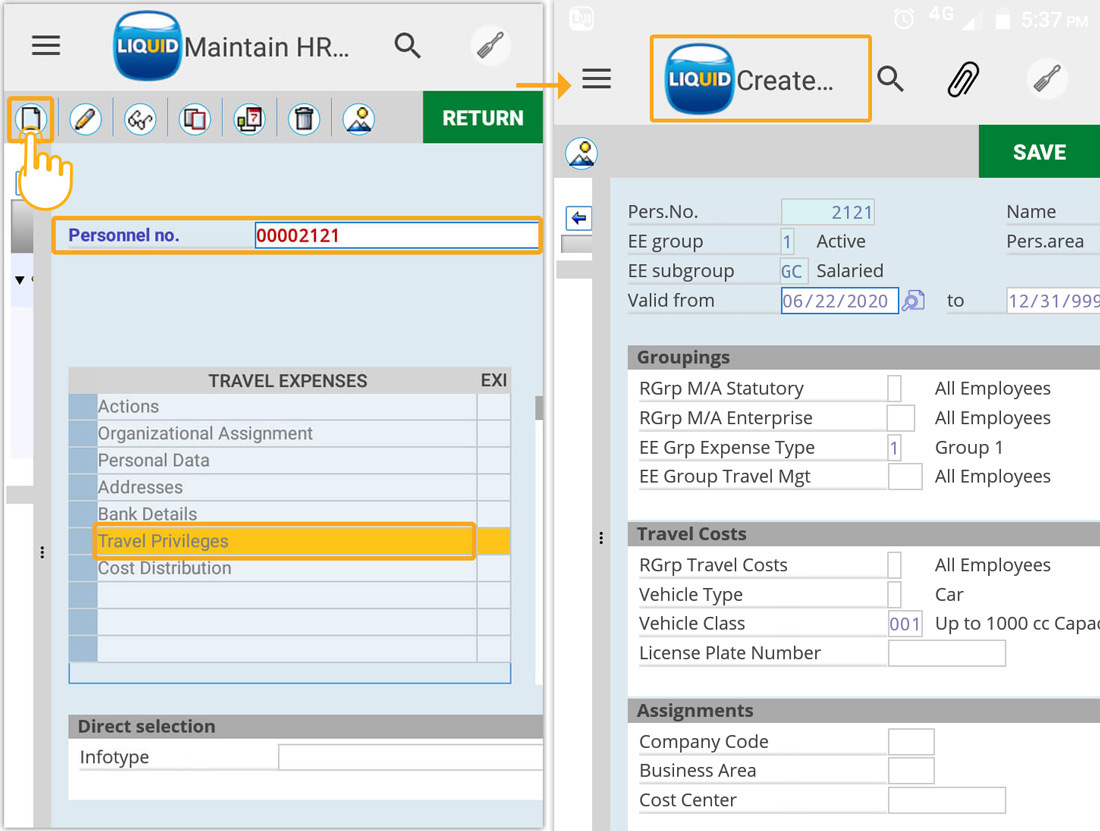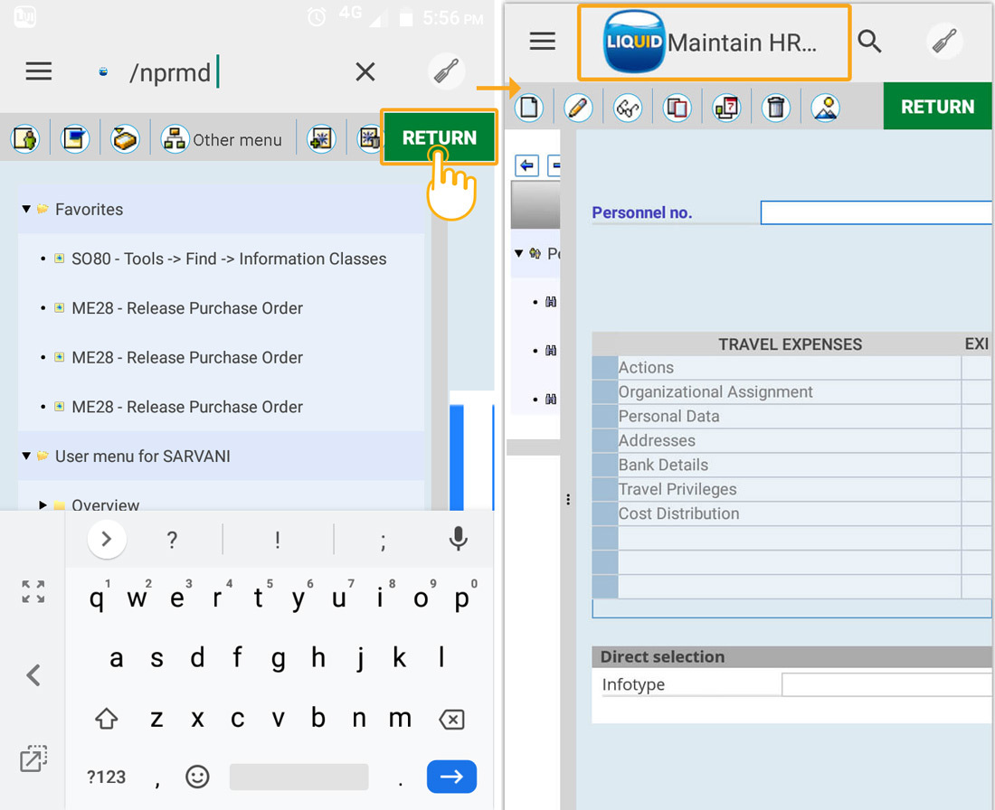 - To navigate to PRMD (Maintain HR master data) transaction in your Liquid UI for Android App, enter /nPRMD in the tcode field, and click Return.