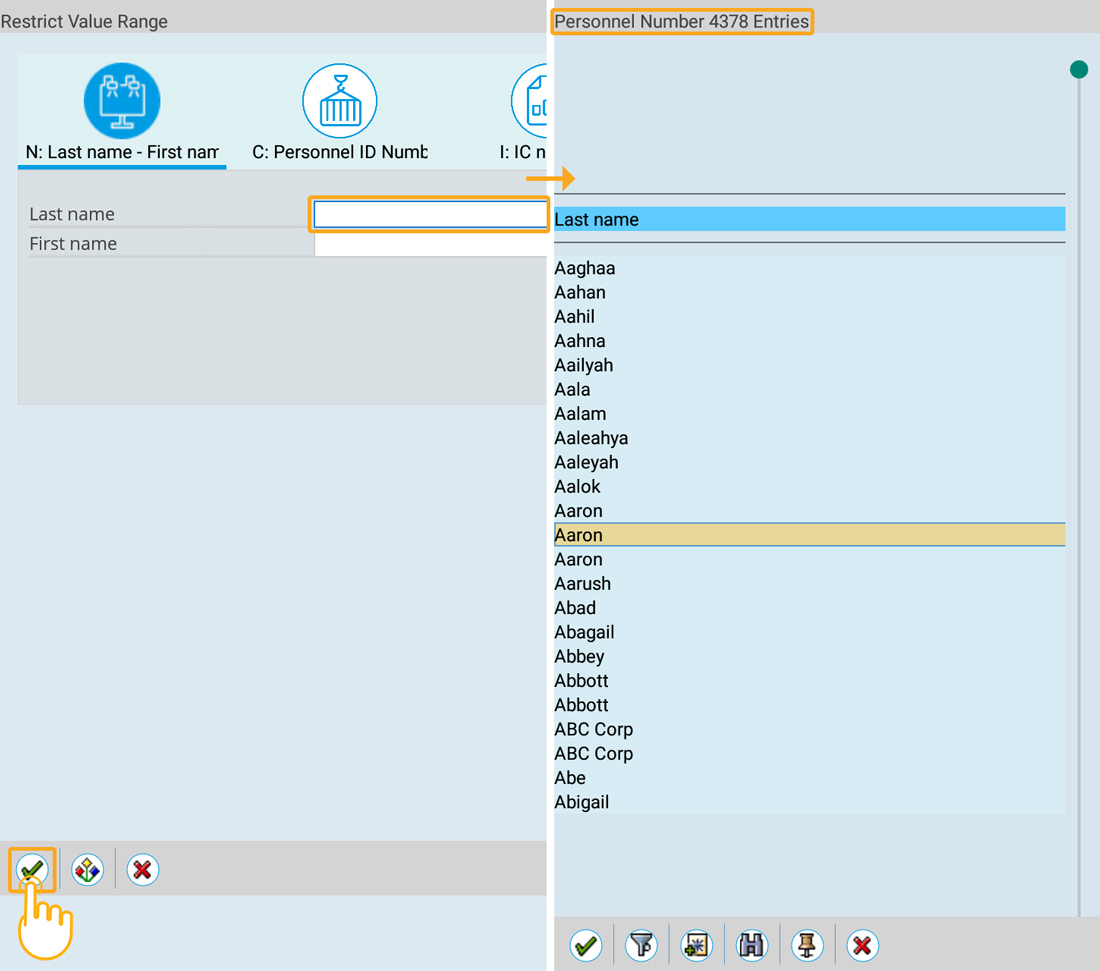 - Place the cursor on the Last name Input Field and click the continue button. You will be able to view the possible entries for the Personnel no. Input Field.