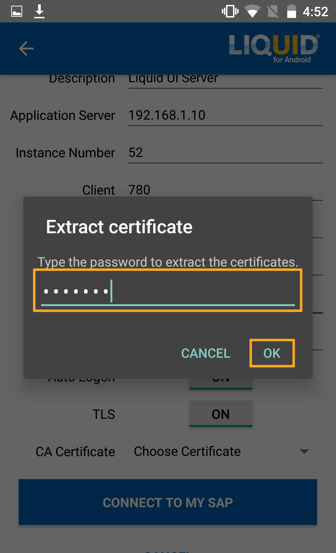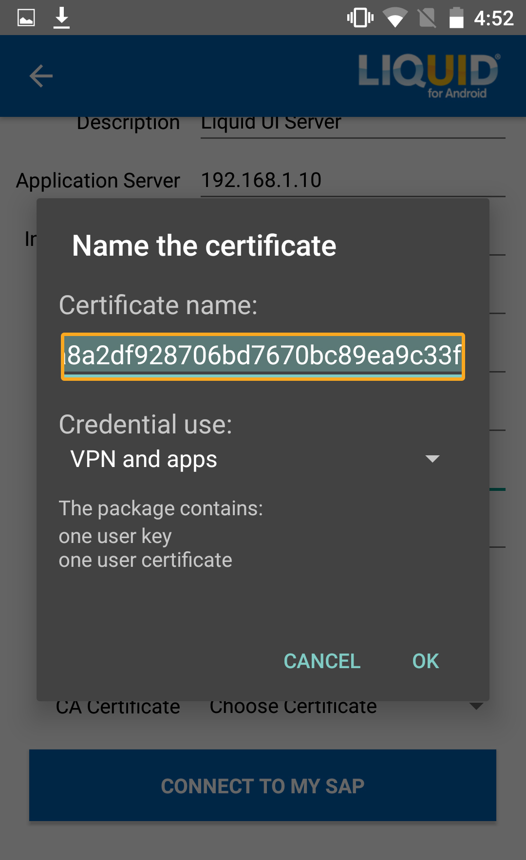 - Import servercert key and Client CA certificate files in your Liquid UI for Android device