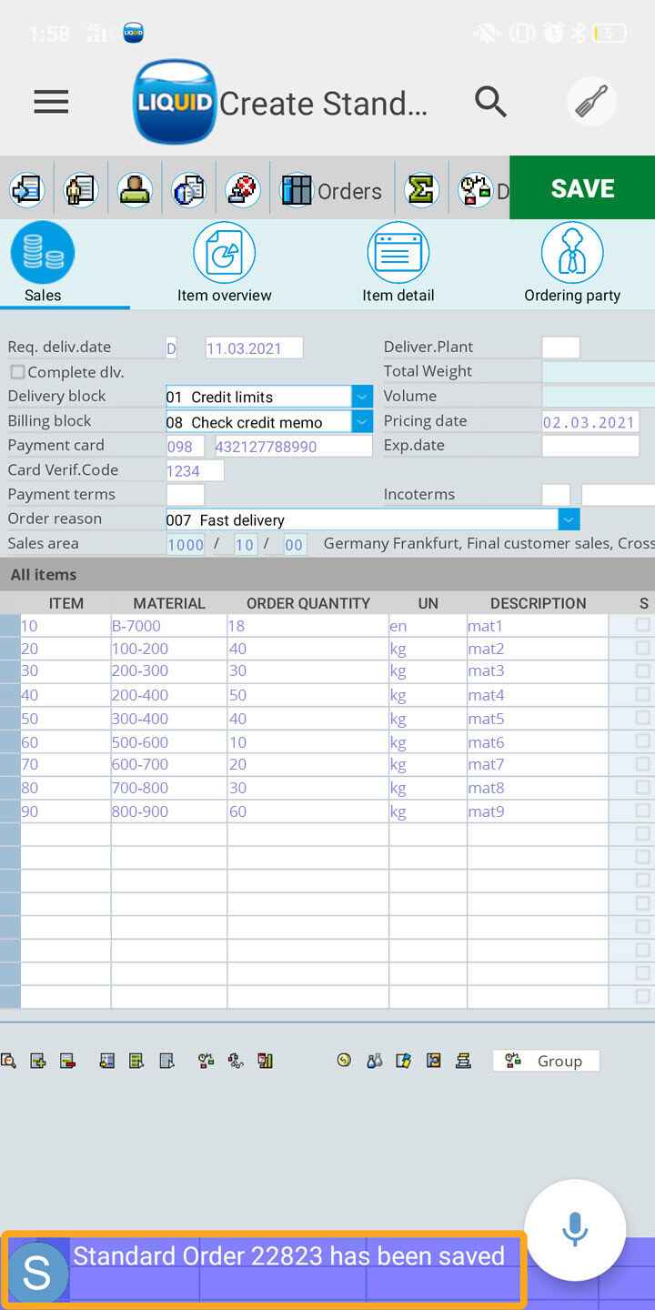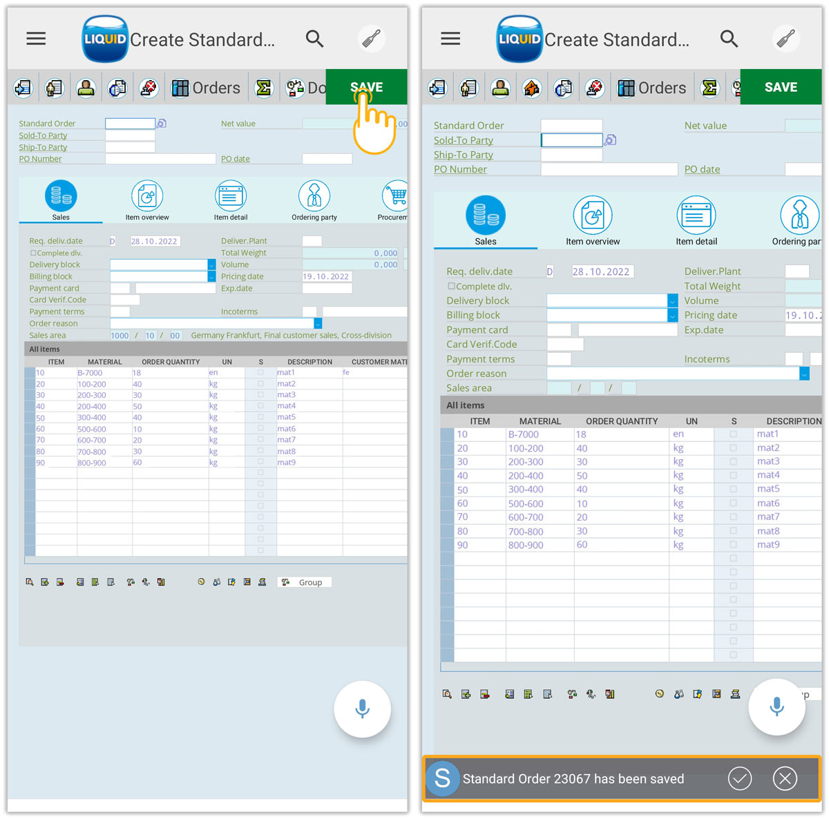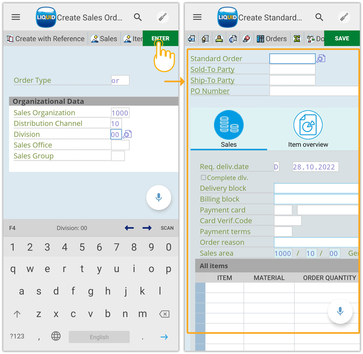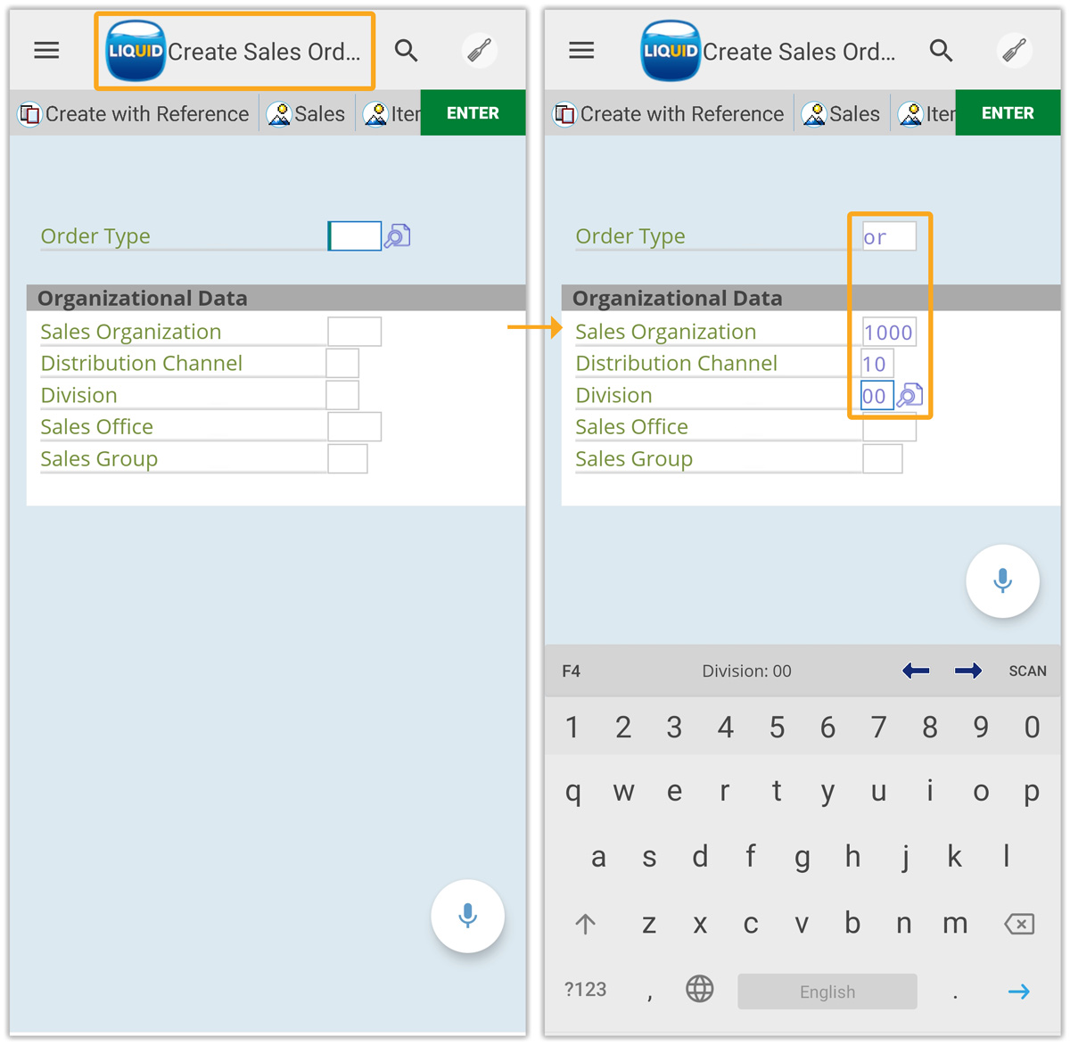 - After connecting to your SAP Server in the Liquid UI App, navigate to the Create Sales Order: Initial screen, and enter the following data in the Input Fields, as shown below: