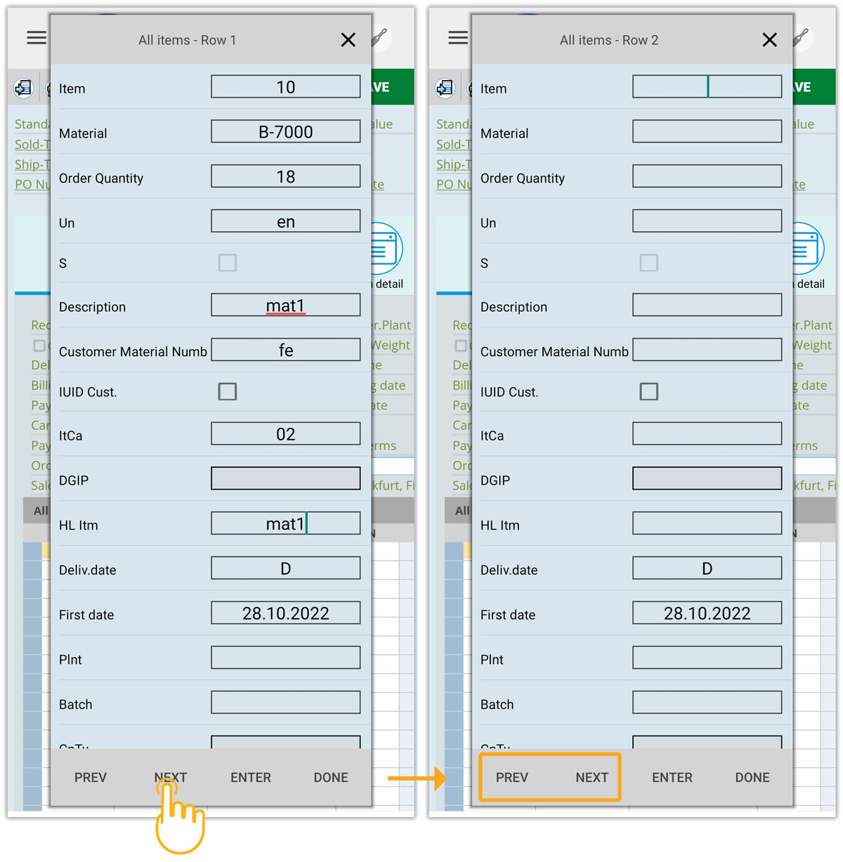 - Click the PREV and NEXT buttons to navigate between the rows and add row data, as shown below: