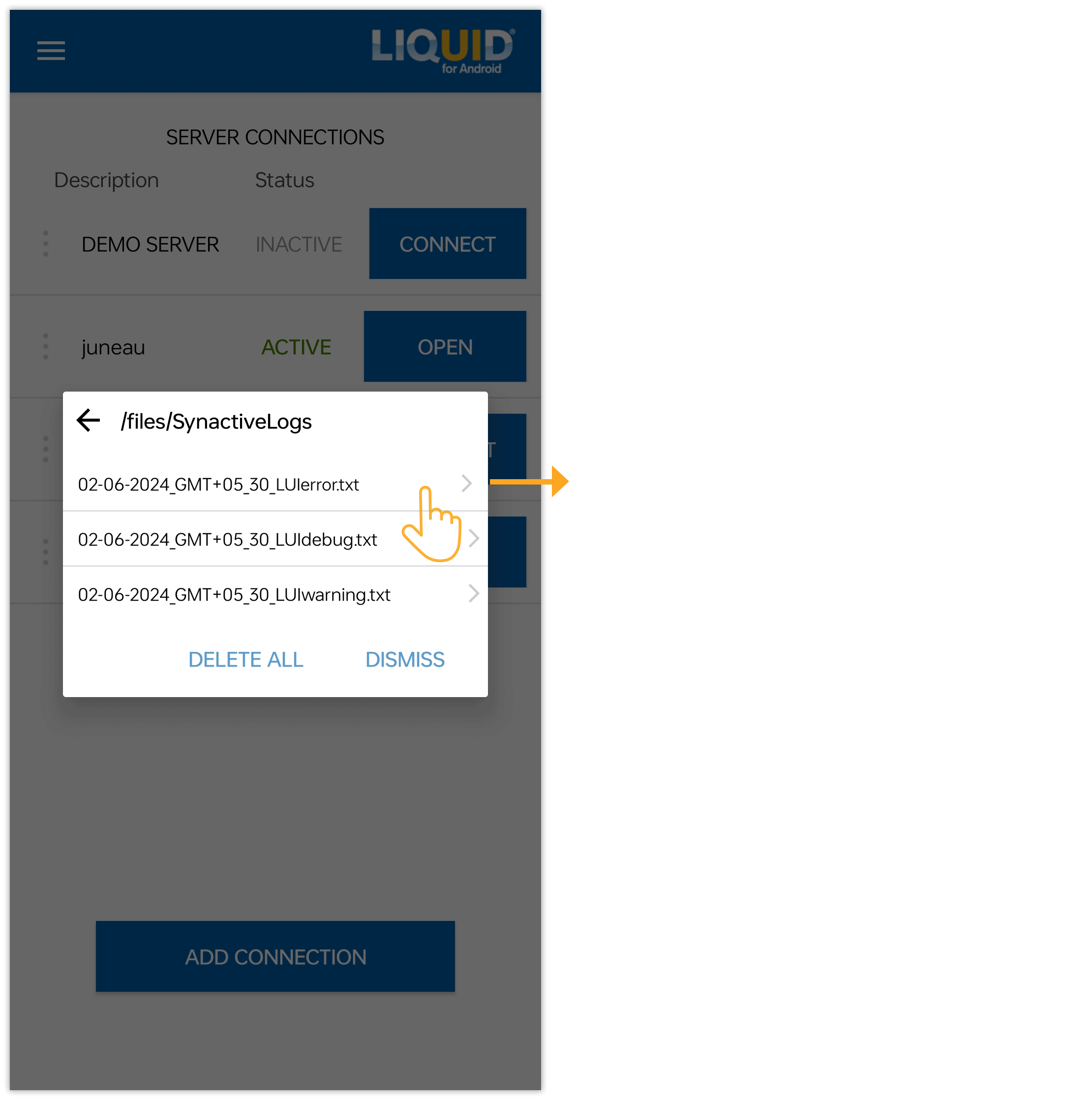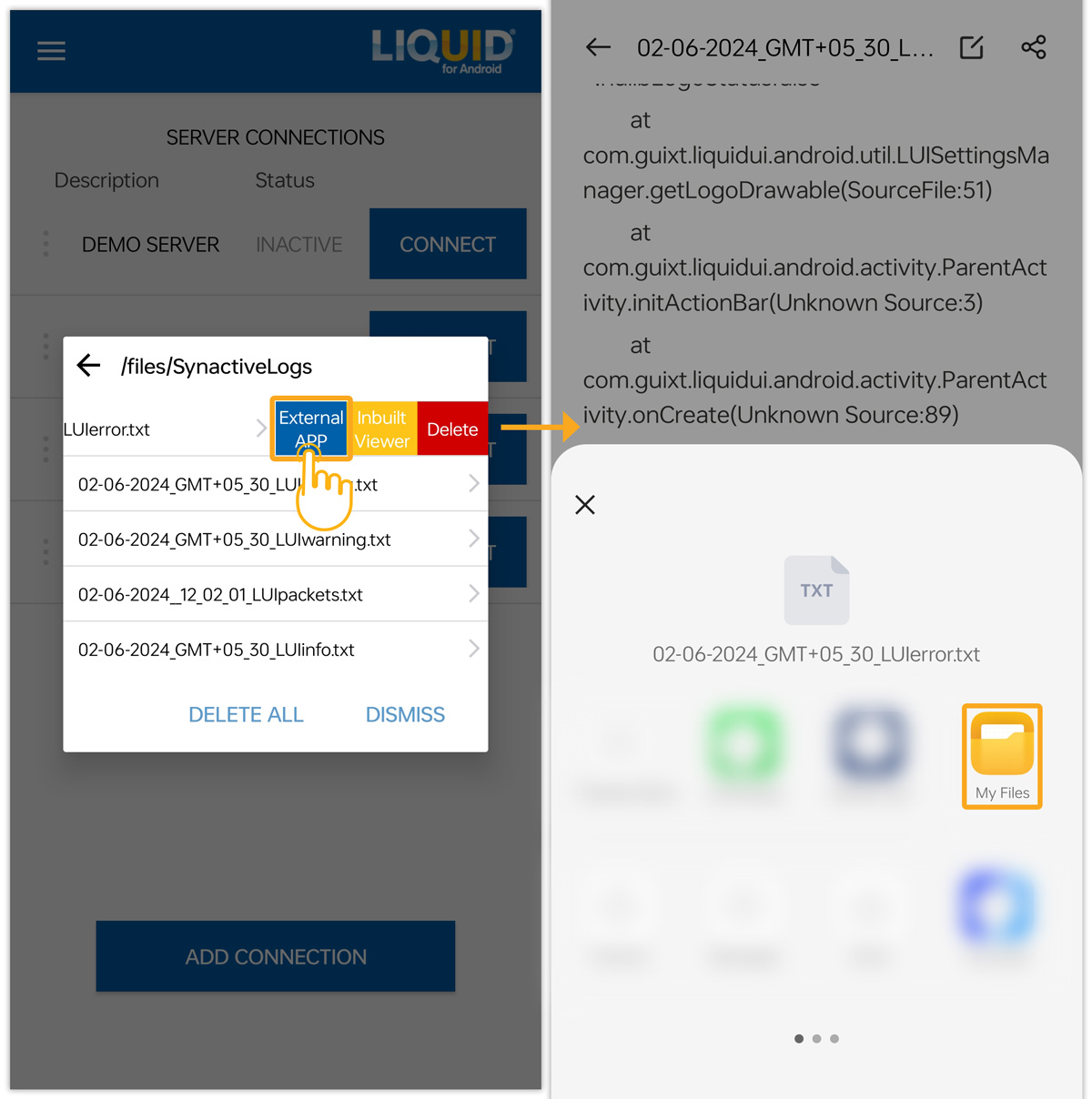 - To transfer device logs to your desktop, you must first save the log files to your device. To do this, click on the External APP icon and select the desired application to view your files. Once you've selected the desired application, you can save the files to your device and then transfer them using an external cable.