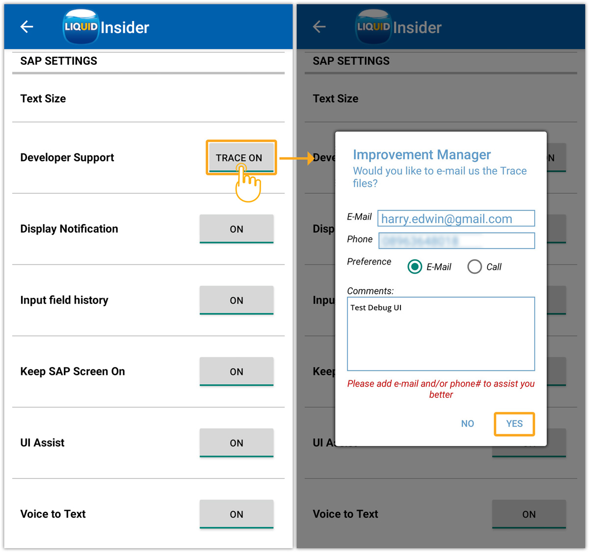 To generate a report, TURN OFF the Developer Support. This displays the Improvement Manager popup window. Now, fill in the required details, and click Yes to send an email to Synactive for review, as shown below.