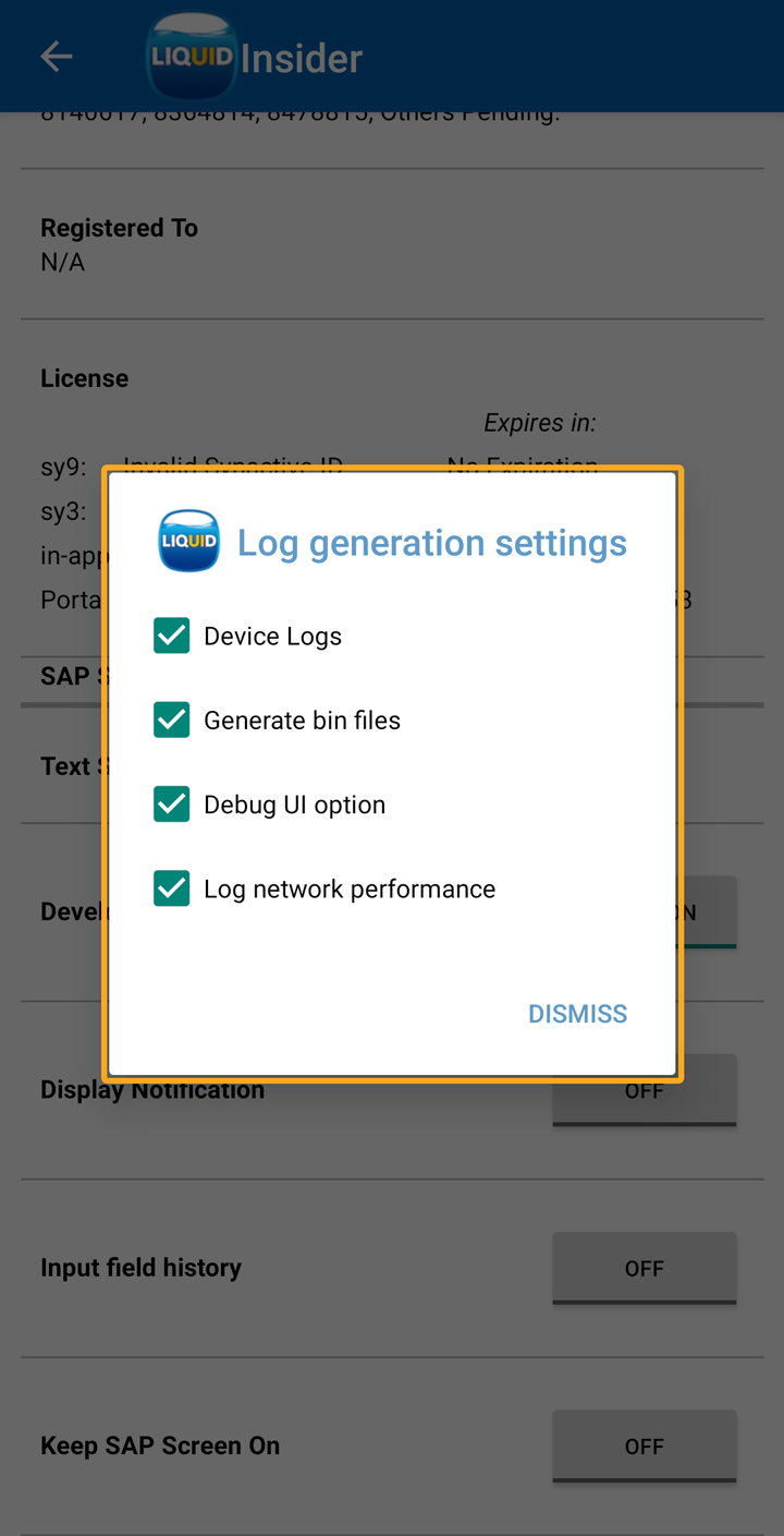 - A long press on the Developer Support option displays the Log generation settings popup window with options Device Logs, Generate bin files, Debug UI option, and Log network performance, as shown below.