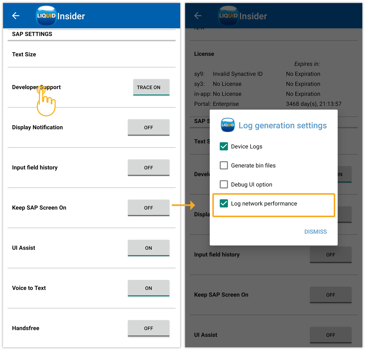 - Trace ON the Developer Support and perform some SAP transactions. Now, long press on the Developer Support option and select the Generate bin files checkbox.