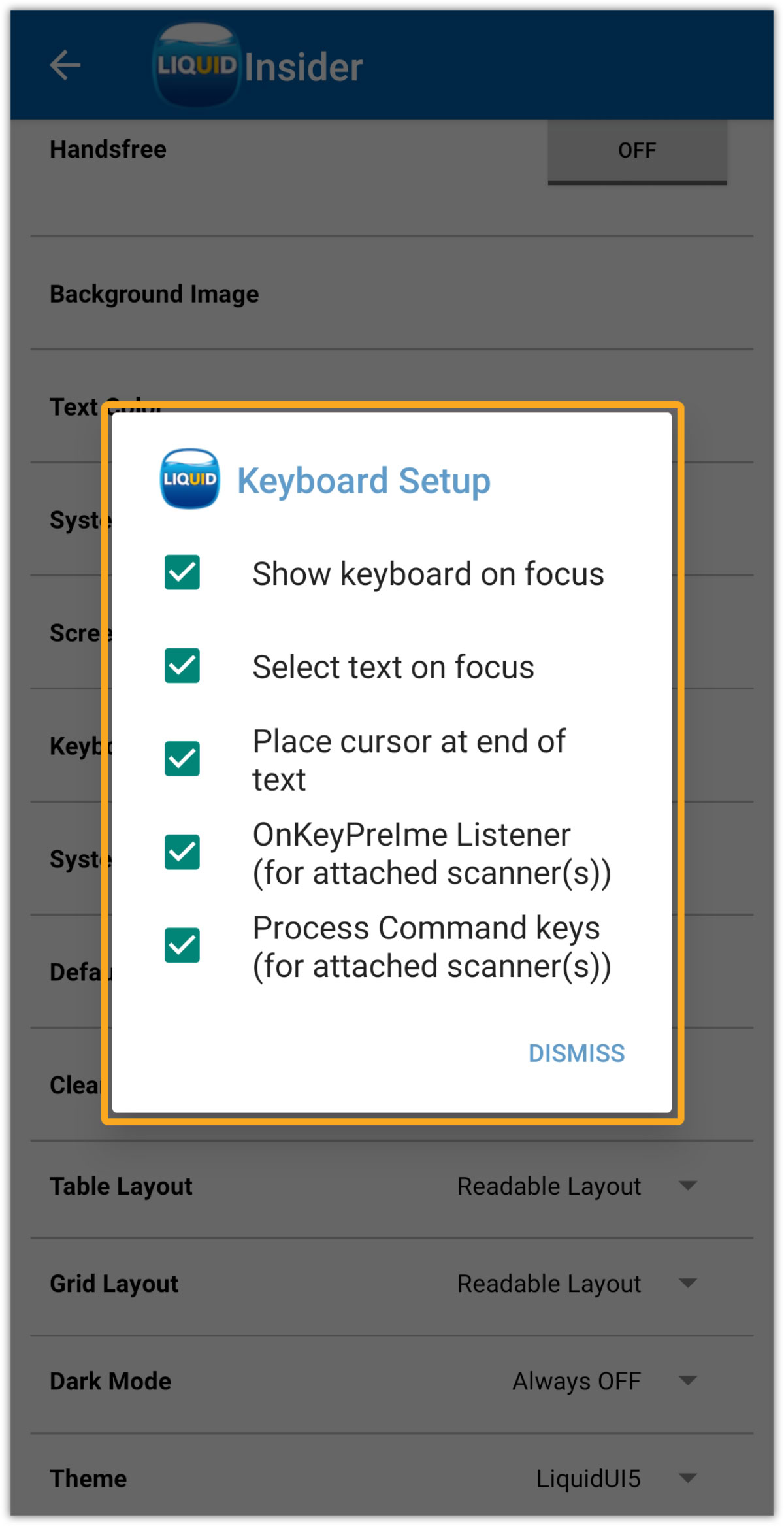 - Upon clicking Keyboard Setup, the following options appear in a pop-up window: Show keyboard on focus, Select text on focus, Place cursor at end of text, OnkeyPrelme Listener (for the attached scanner(s)), Process Command keys for the attached scanner(s) with checkboxes, as shown below.