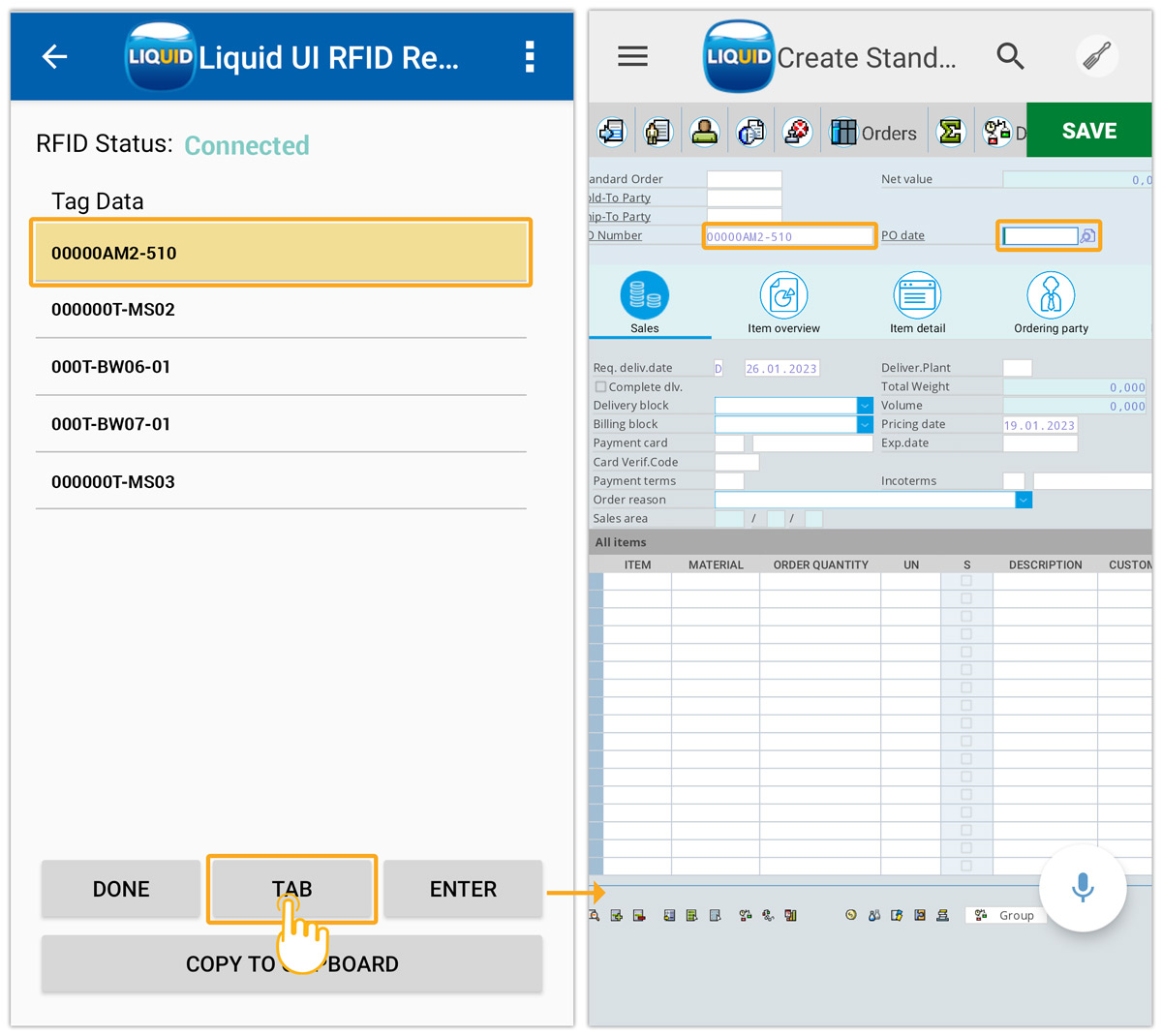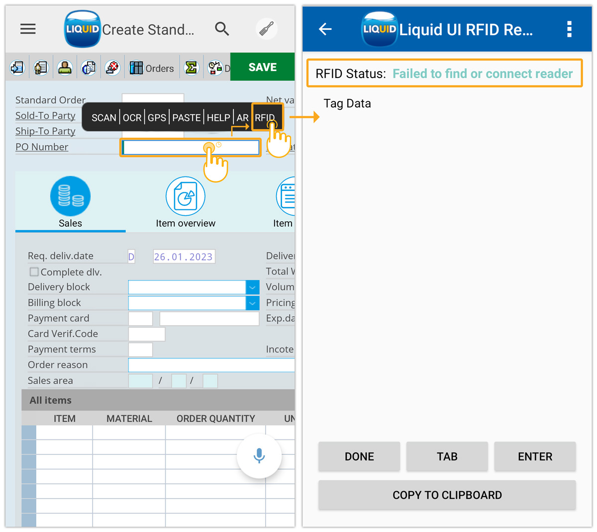 Liquid UI RFID Reader screen contains four options, DONE, TAB, ENTER, and COPY TO CLIPBOARD, to copy the scanned tags to the Input Field on an SAP transaction, as explained below.