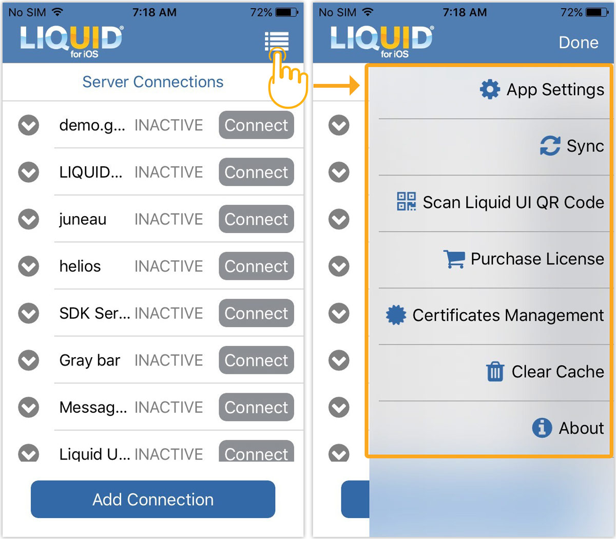 - Open the Liquid UI App. On the Server Connections screen, click the Main Menu placed in the upper right corner of the screen to see all the menu options.