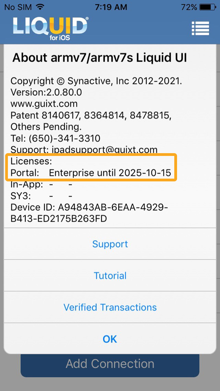 - Click About to see the license information of the Liquid UI App, as shown below.
