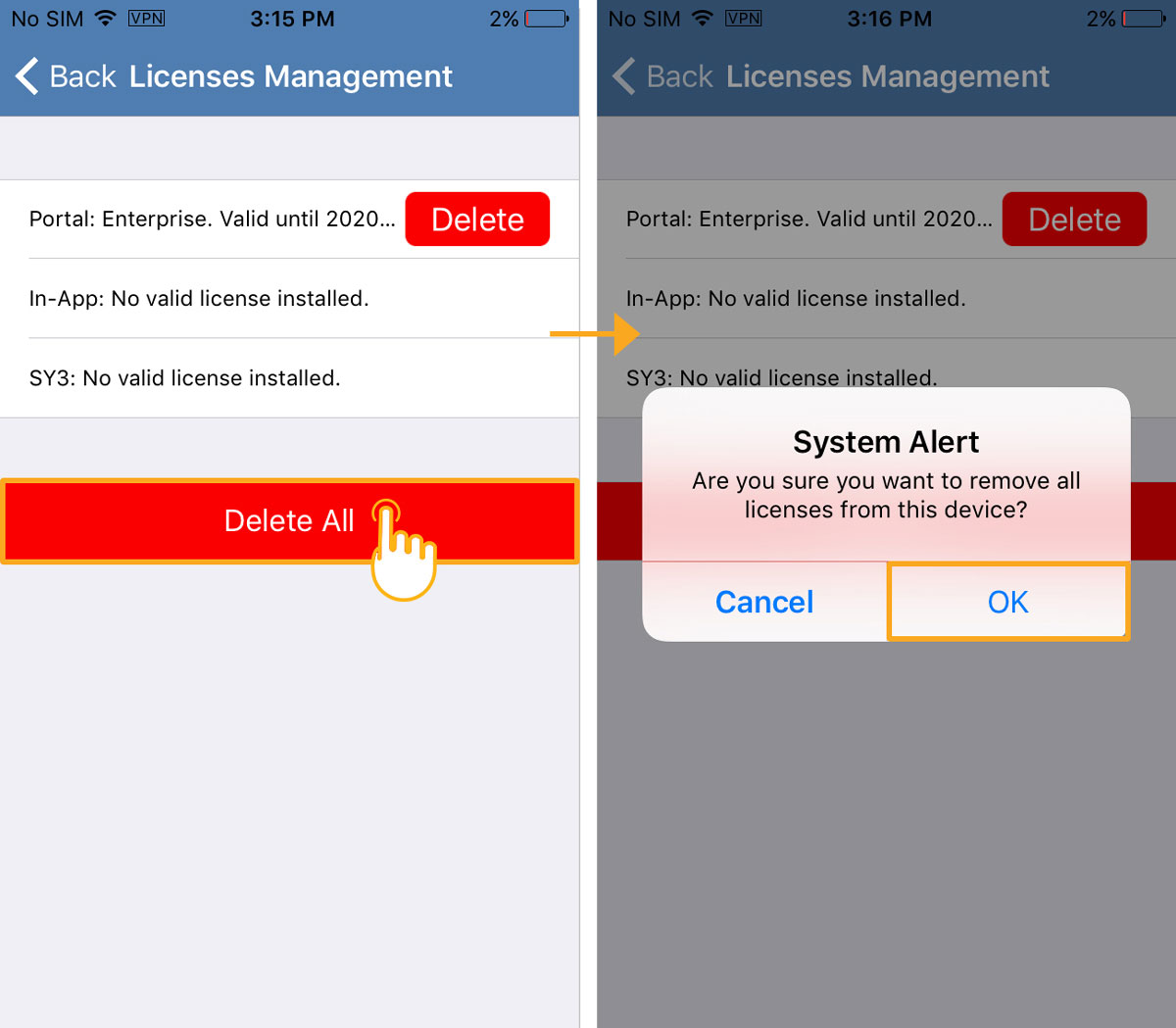 - Click the Delete All option to delete all the licenses from your device. You will see a System Alert pop-up message asking you to confirm the removal of the licenses, and click OK to delete all the licenses.