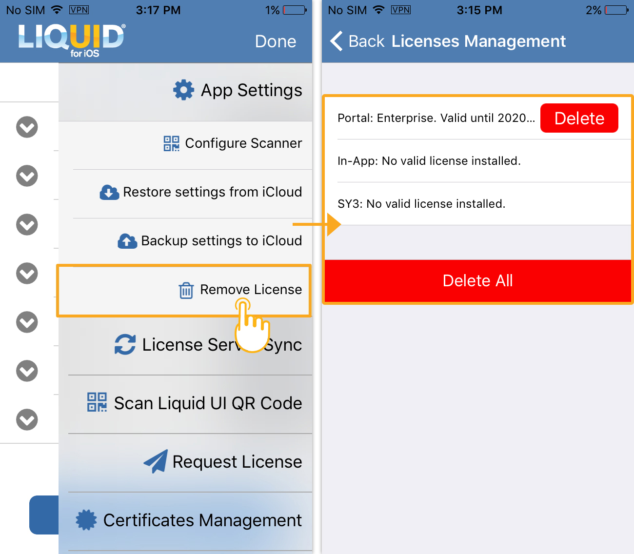 Note: You can remove all installed licenses from your device, including Portal, In-App, and SY3 licenses.