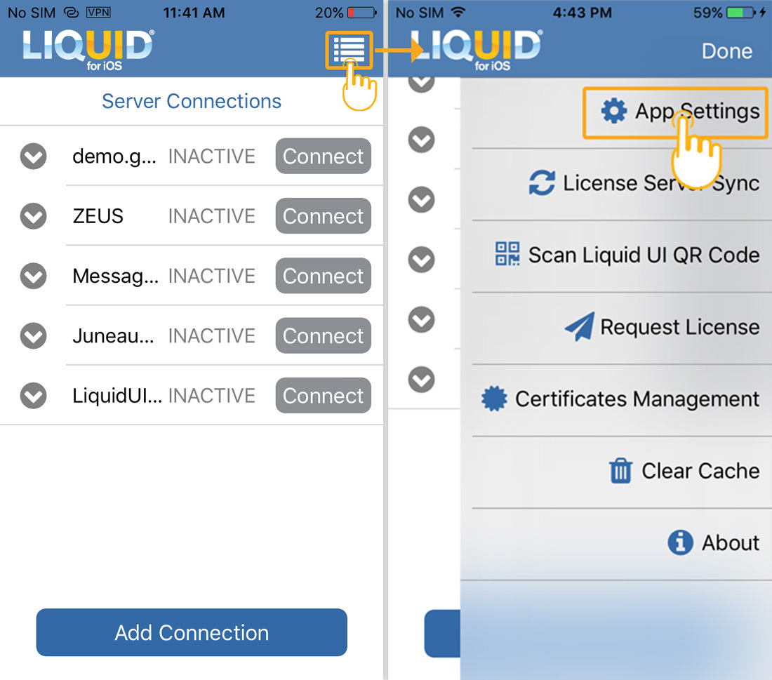 present on the upper right corner of the server connections screen, and then select App Settings, as shown below.