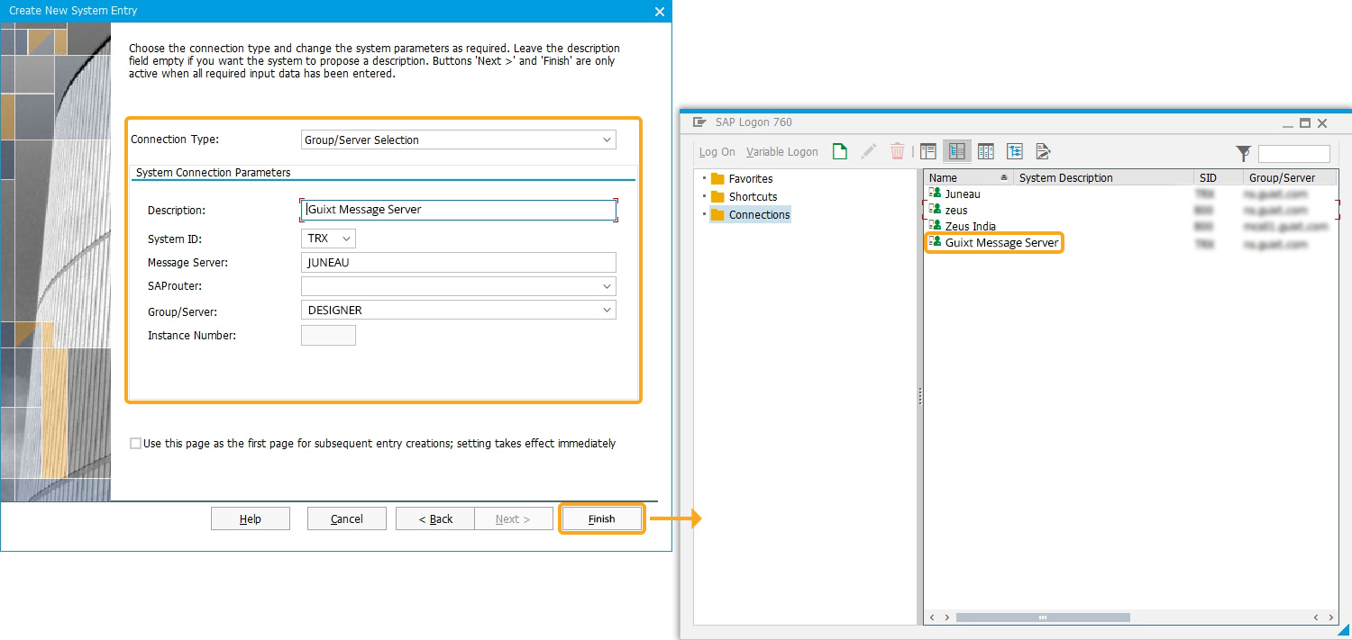 - To add a Message Server in SAP GUI, create a new system entry, fill in the required input data, and click the "Finish" button. Once completed, you can see the newly added Message Server in the Connection list, as shown below.