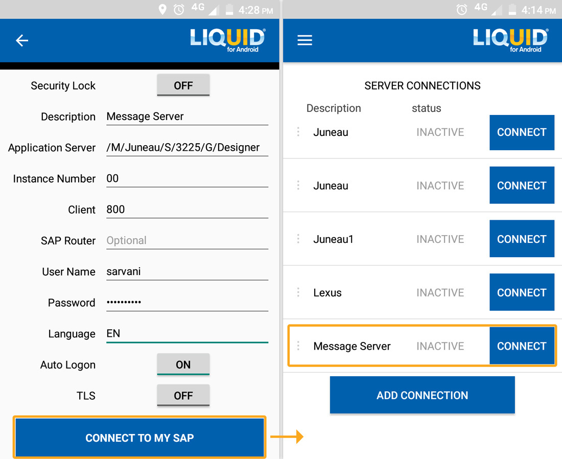 - Open Liquid UI for Android App. Click ADD CONNECTION to add a new Server connection.