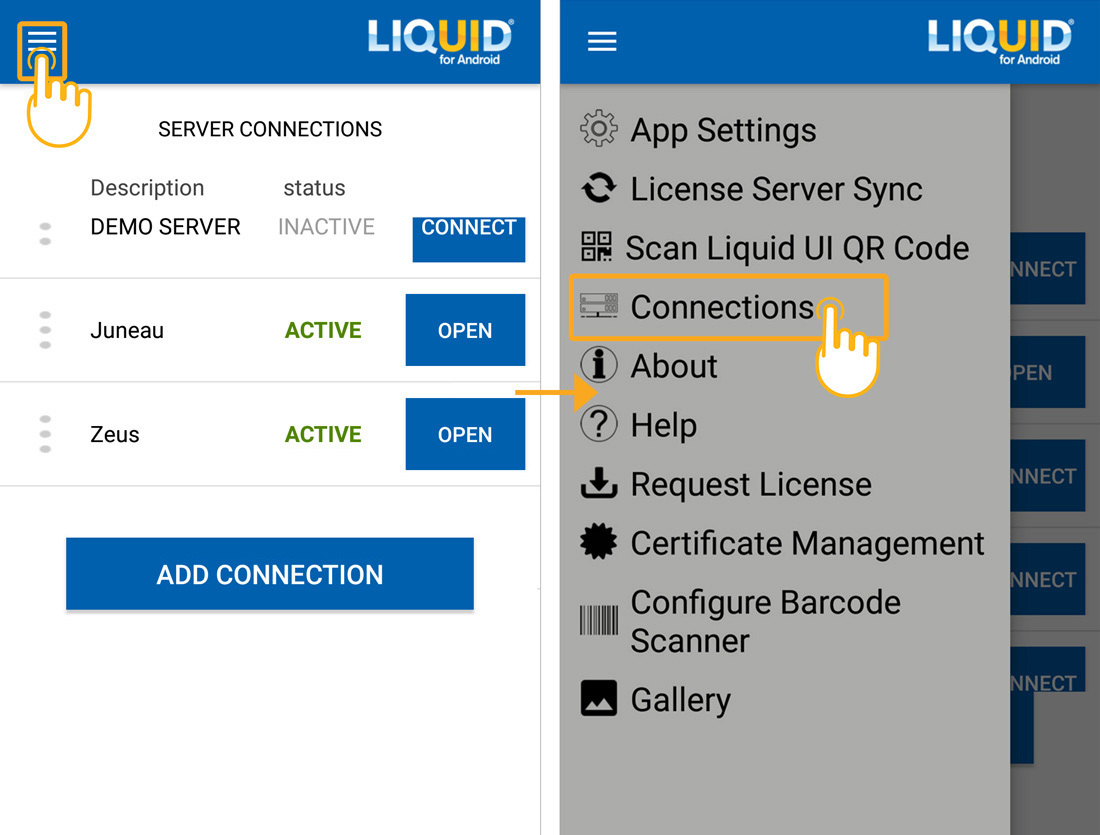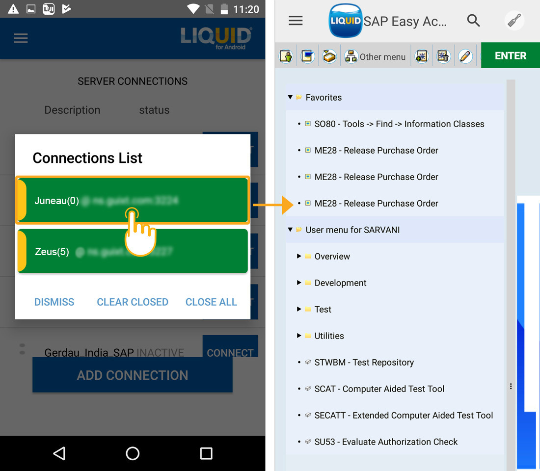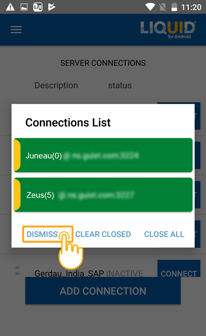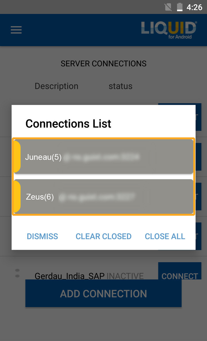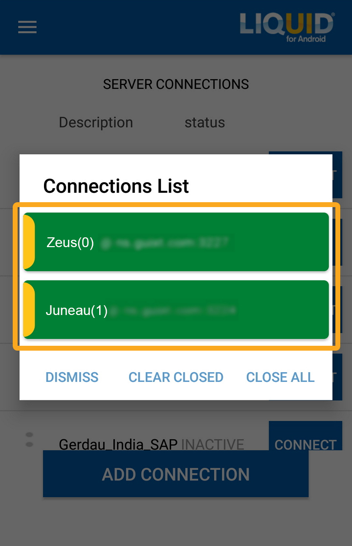 Liquid UI for Android enables you to connect to multiple SAP Servers at the same time. When you login to multiple connections, you can perform various actions using the Connections option. You can view all the active connections, navigate to the desired active connection, and close all the active connections from the Connections List.