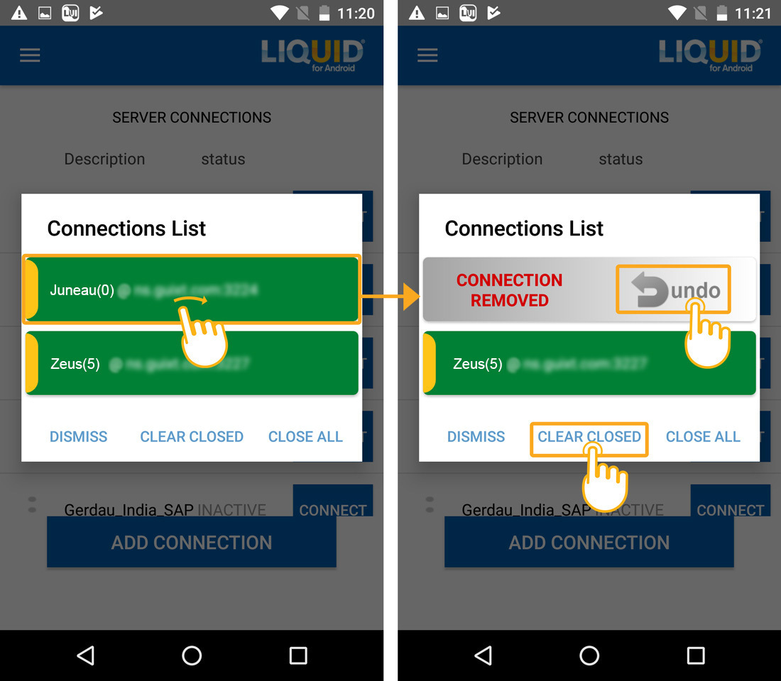 To remove a connection, right swipe as demonstrated below and select the CLEAR CLOSED option to close the connection. However, click undo to revert your action and stay on the Connections list.