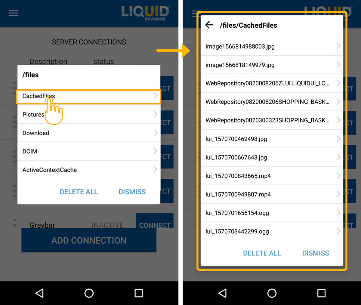 - To view all the files present in the folder of our App, tap on the CachedFiles option. Click on the back arrow to navigate back to the gallery options.