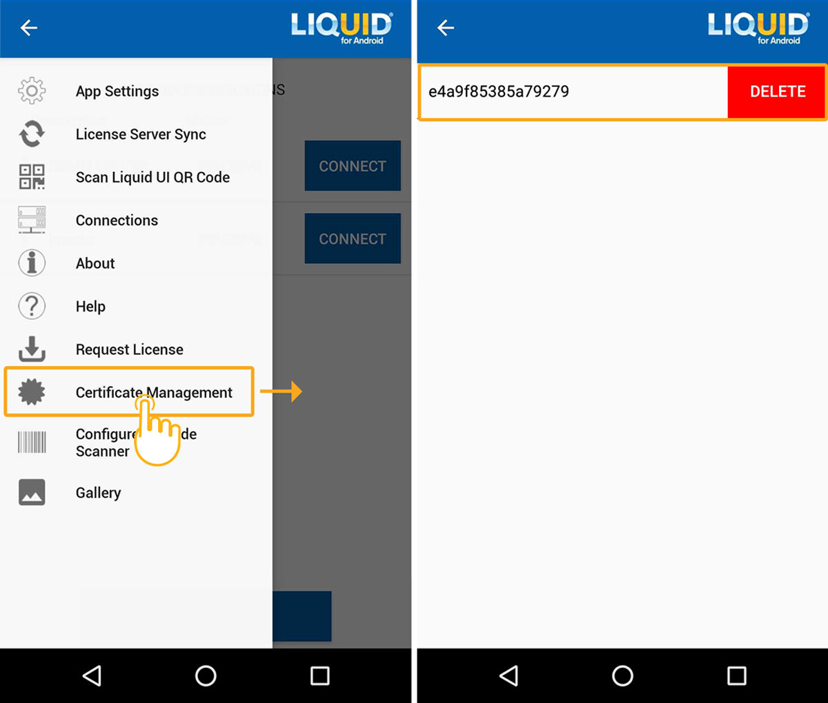 The Certificate Management setting available in the Liquid UI for Android App displays all the installed certificates and also allows the users to delete the installed certificates if required.