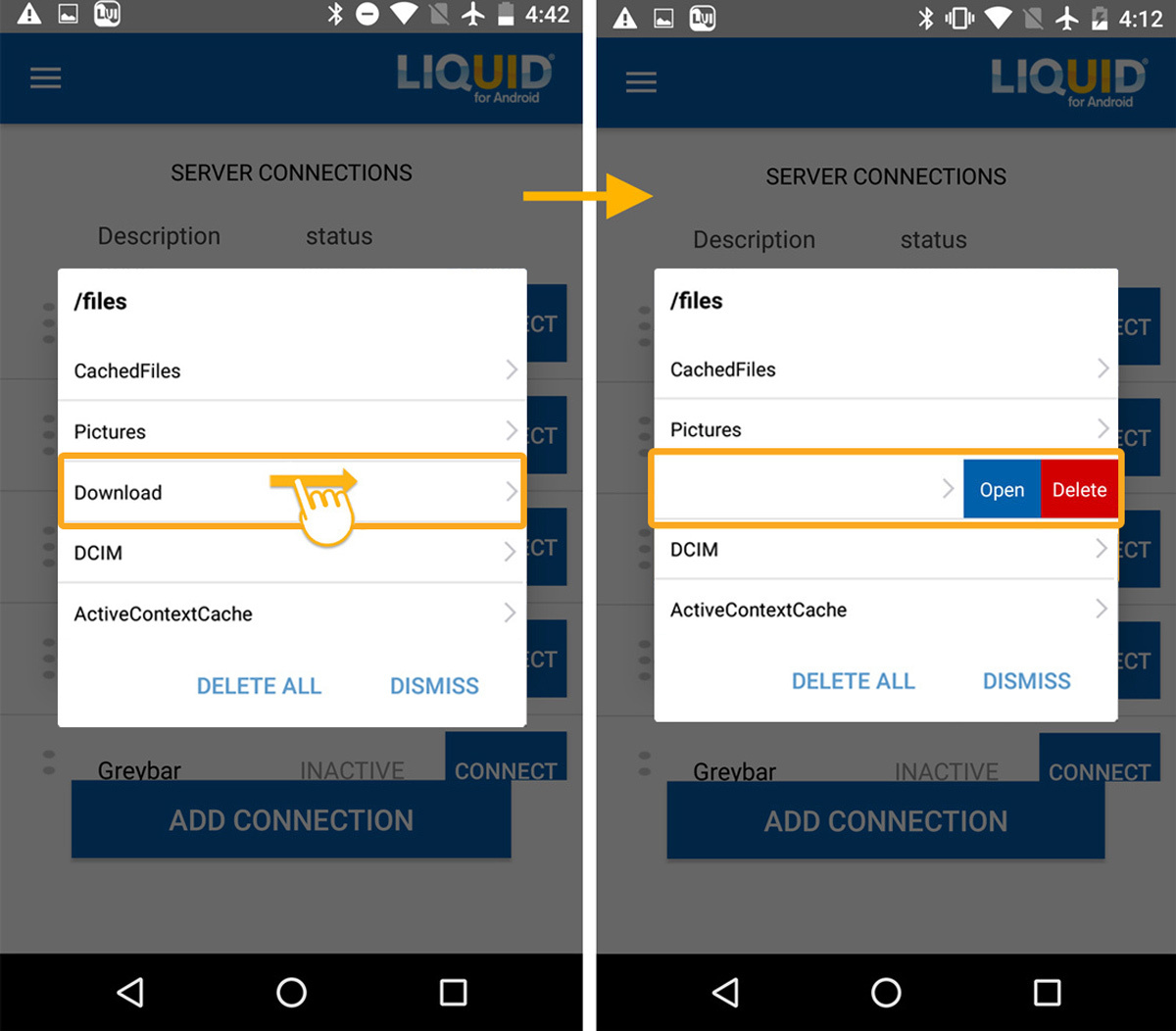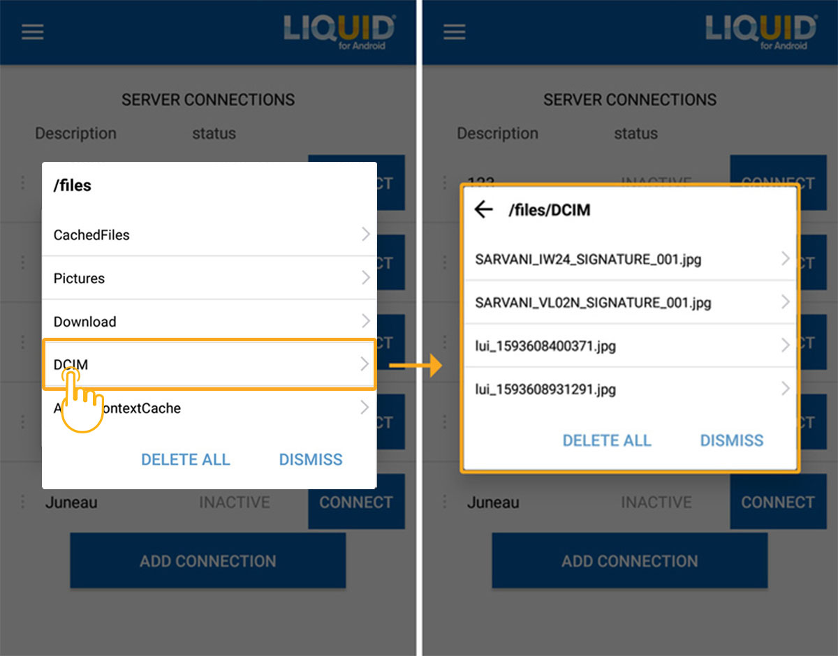 - To view all the uploaded image files to our App, tap on the DCIM folder. Swipe left on the DCIM option to either open or delete all the uploaded image files, using the Open and Delete option.